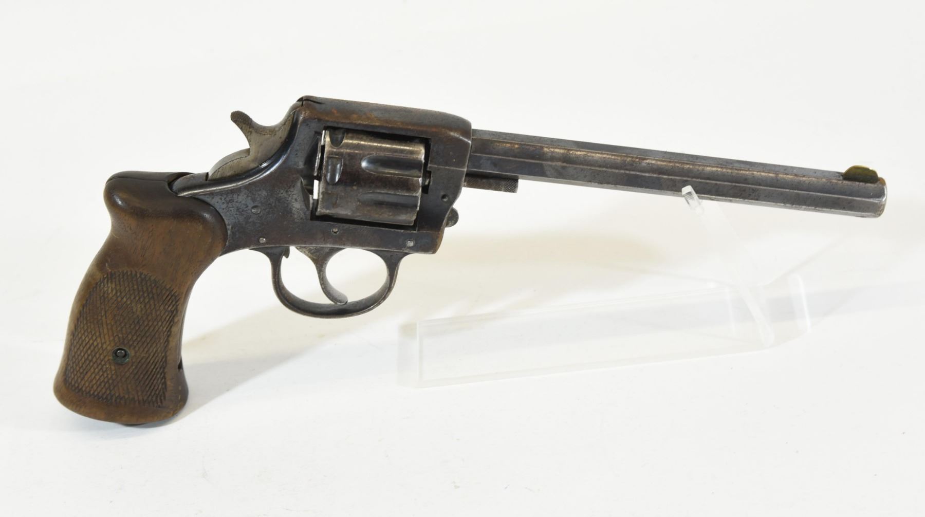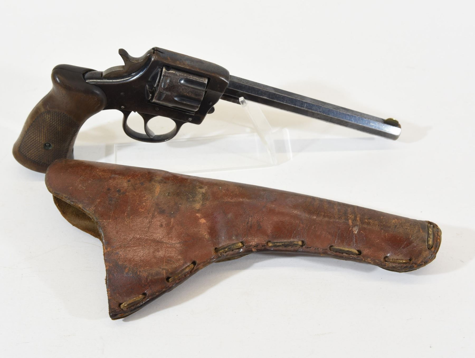 Restricted, revolver, 22LR, 152mm barrel. SN 121203. Wood grips worn, bluing rusted & pitted, bore very good. Double action not working. Comes with leather holster.