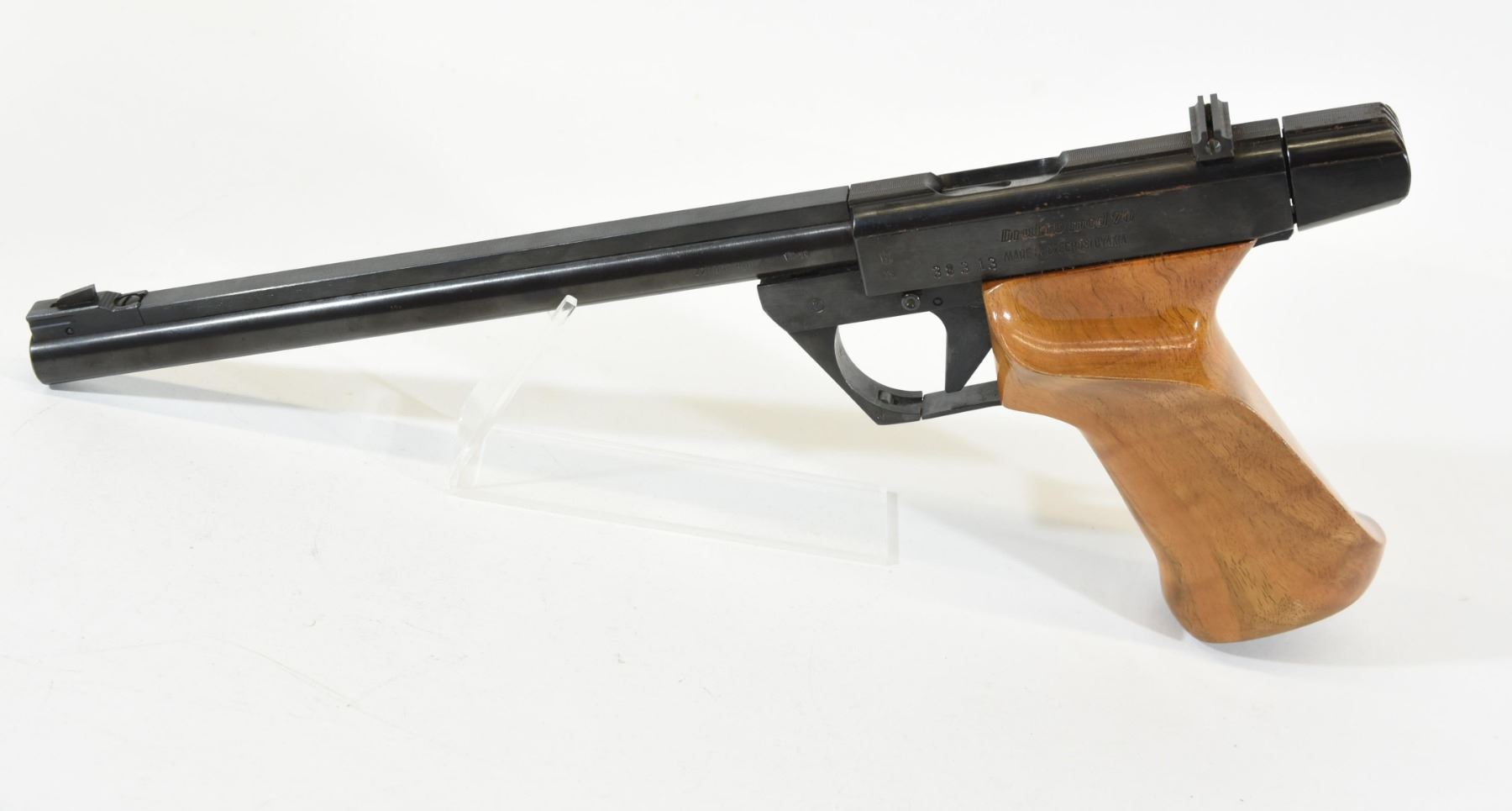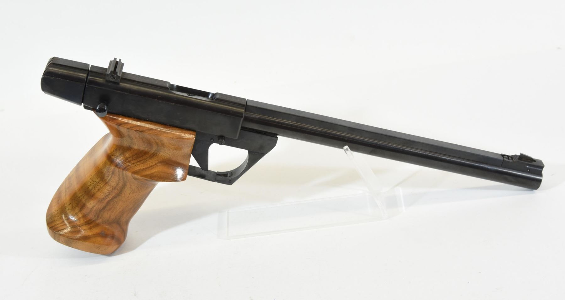 Restricted, single shot, 22LR, 250mm barrel. SN 38313. Custom wood grips very good, bluing has some pitting, bore excellent.