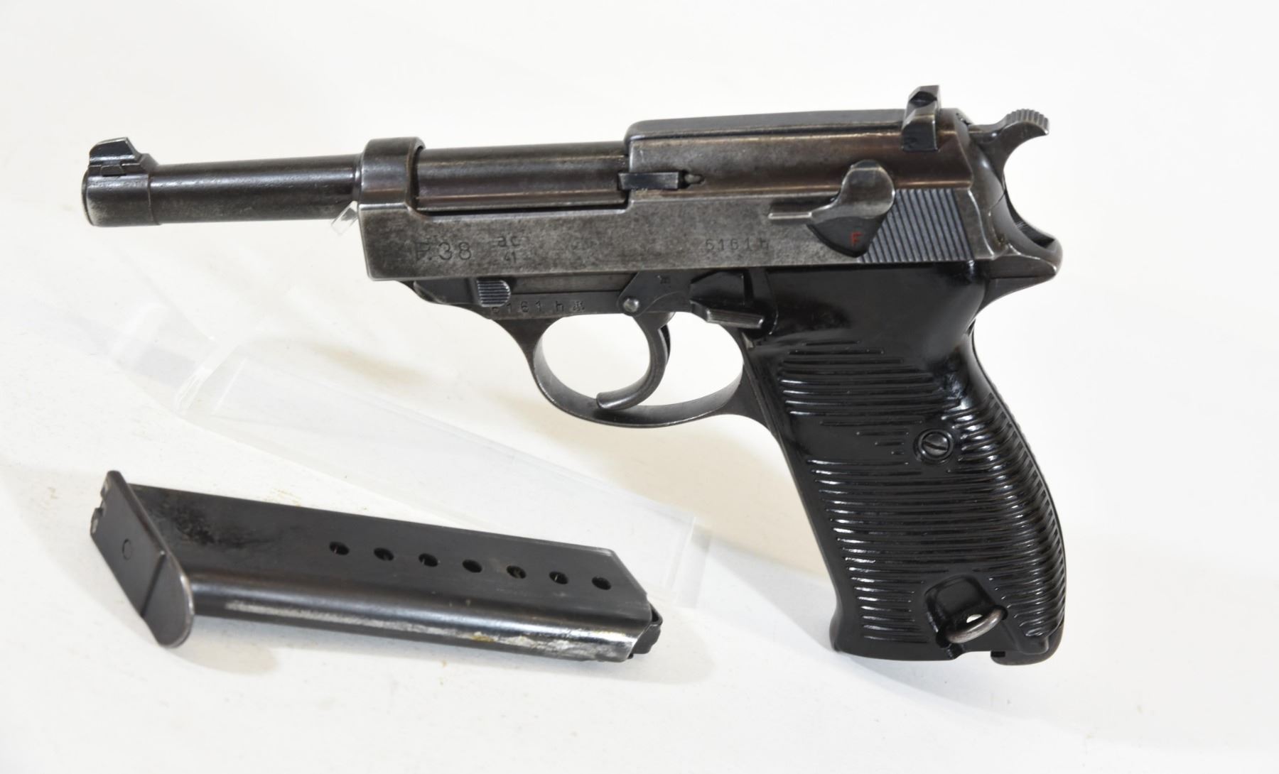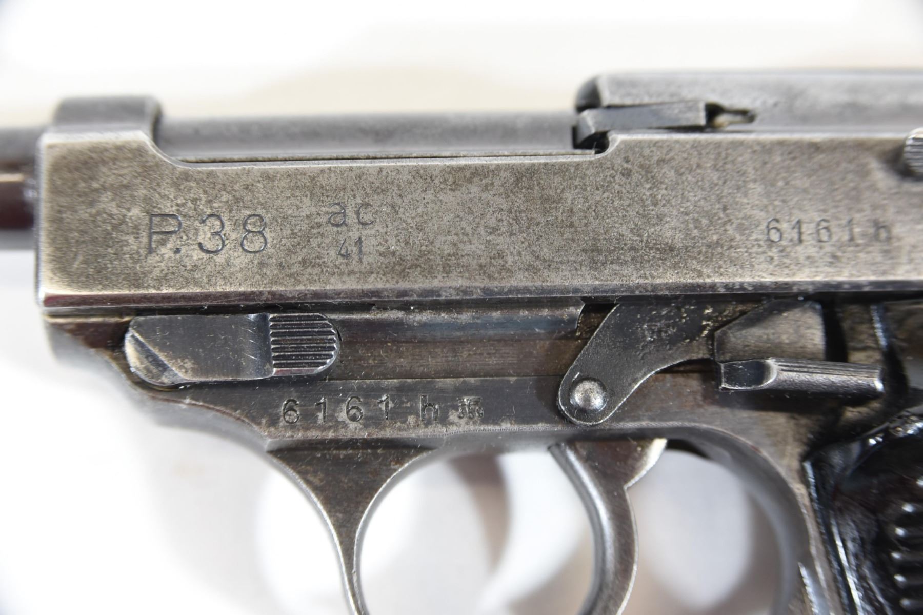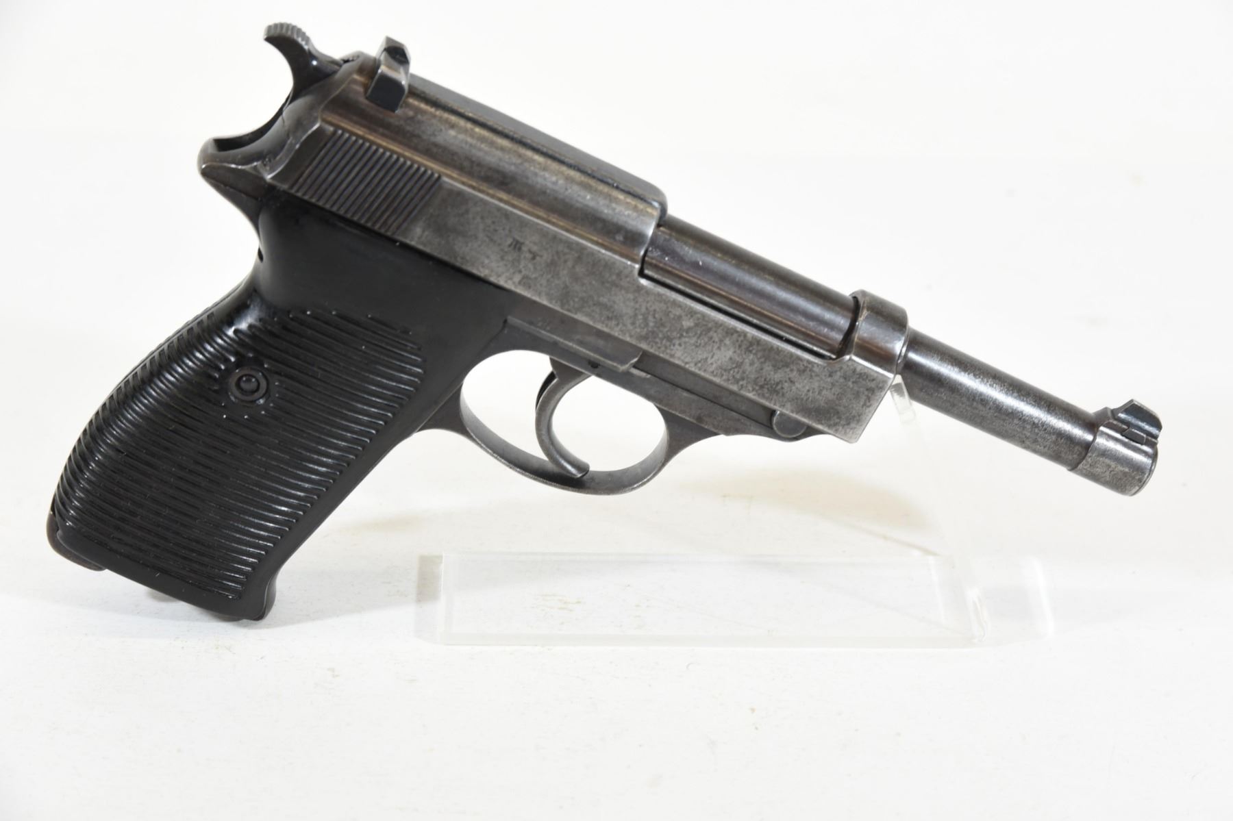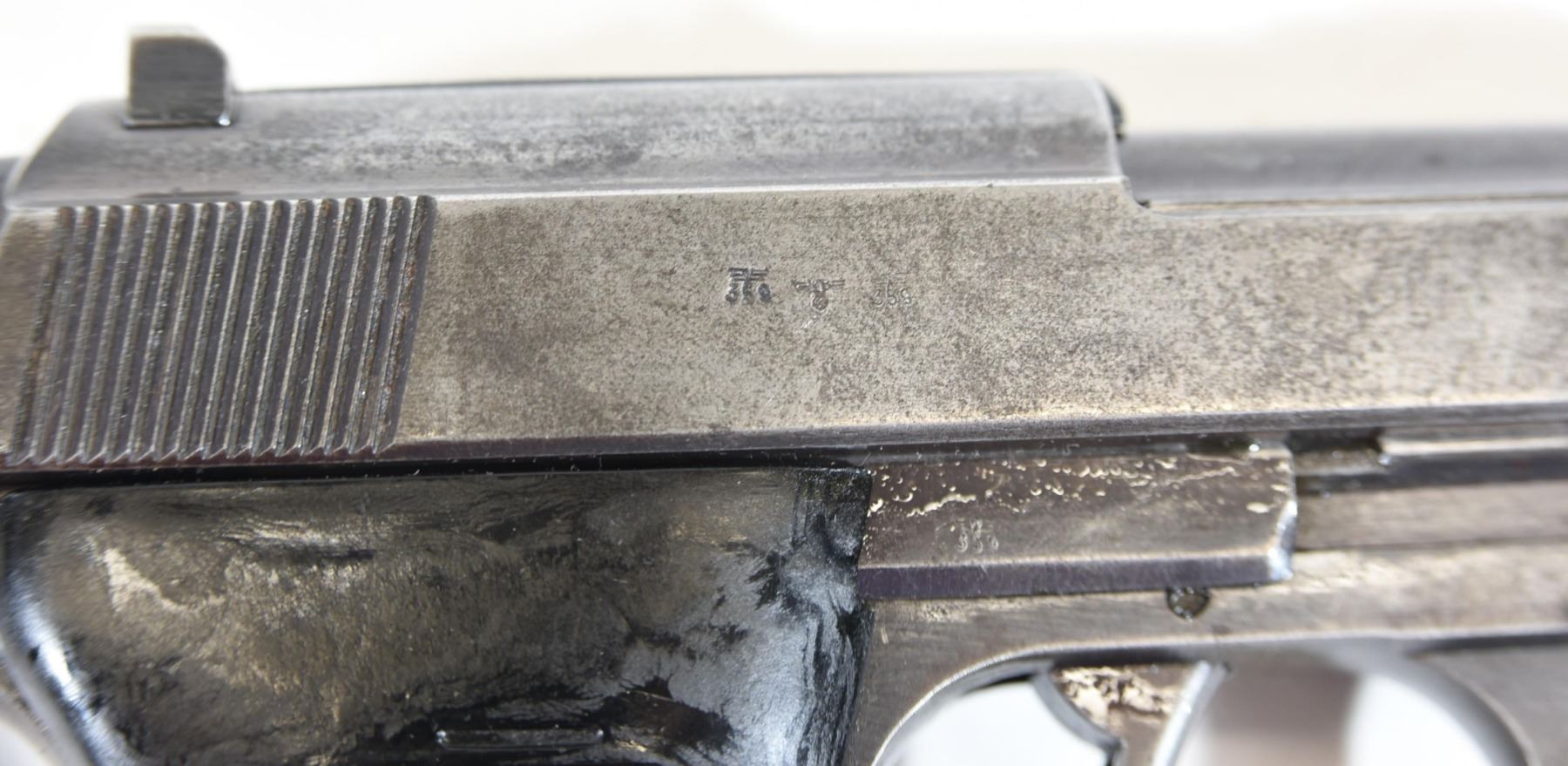 Restricted, semi-auto, 9mm Luger, 121mm barrel. SN 6161H. Grips very good, bluing turning brown, bore has pitting. Imperial eagle and swastika marks.