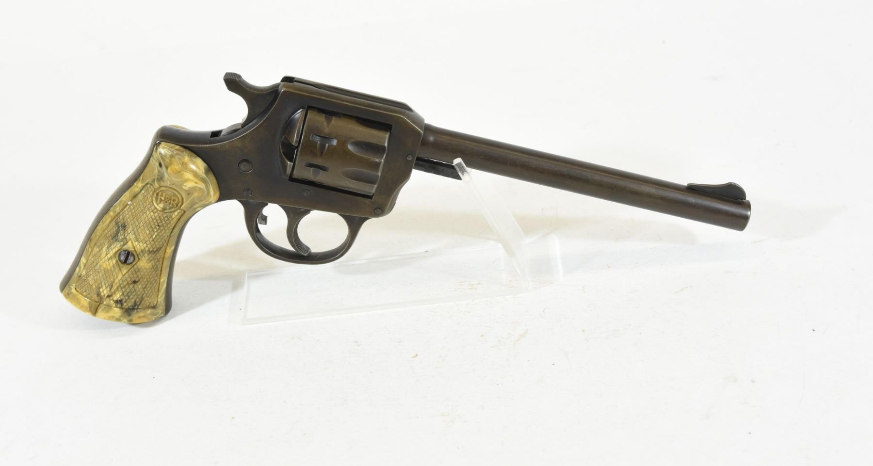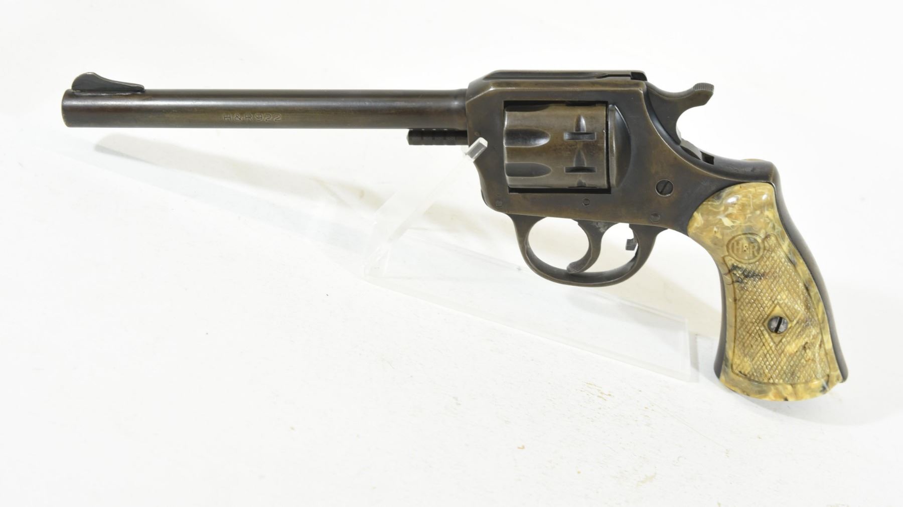 Restricted, revolver, 22LR, 152mm barrel. SN R50967. Grips have a small chip, bluing is brown, bore very good.