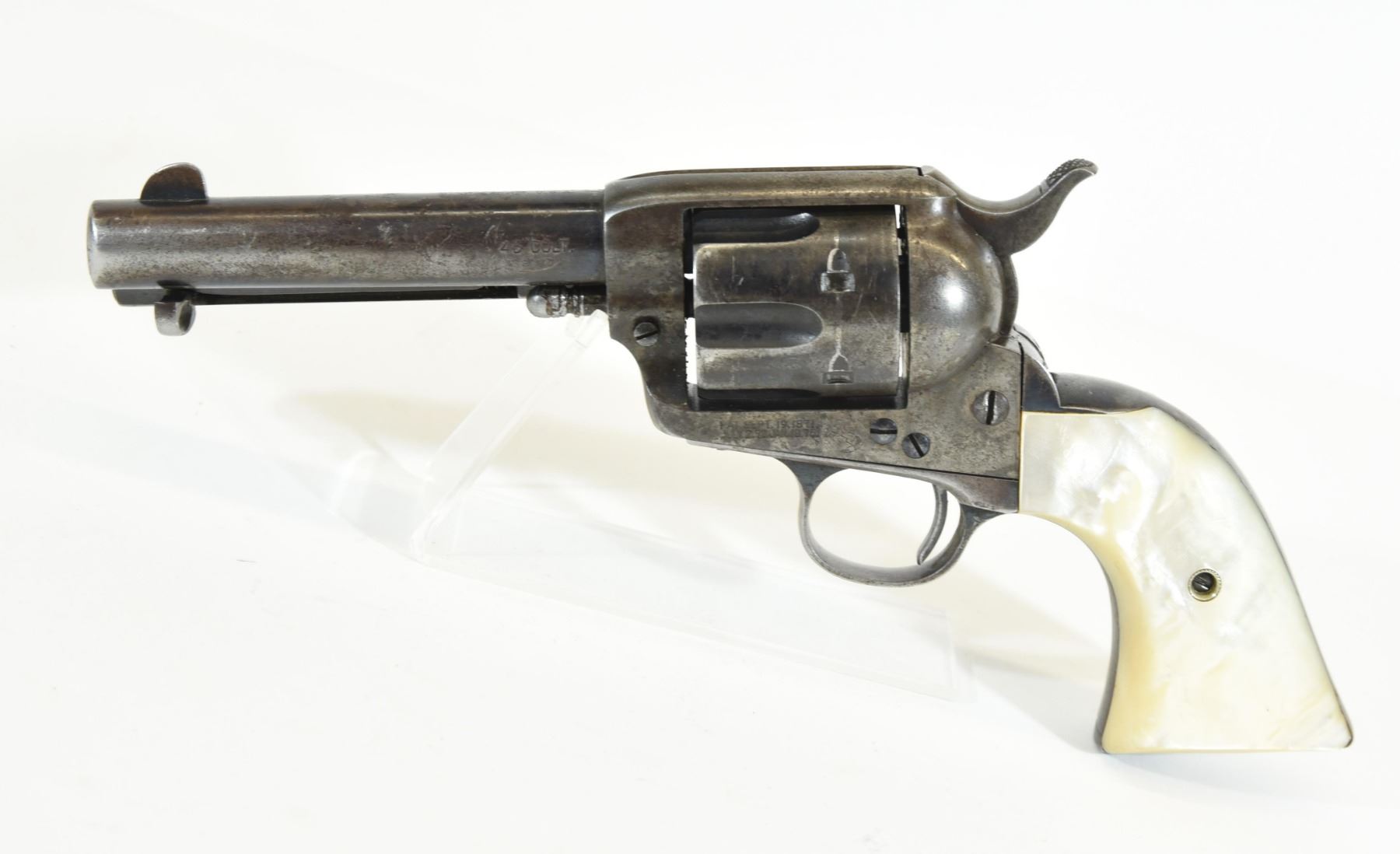Restricted, revolver, 45 Long Colt, 121mm barrel. SN 223344. Grips have chips, bluing turning brown, bore very good.
