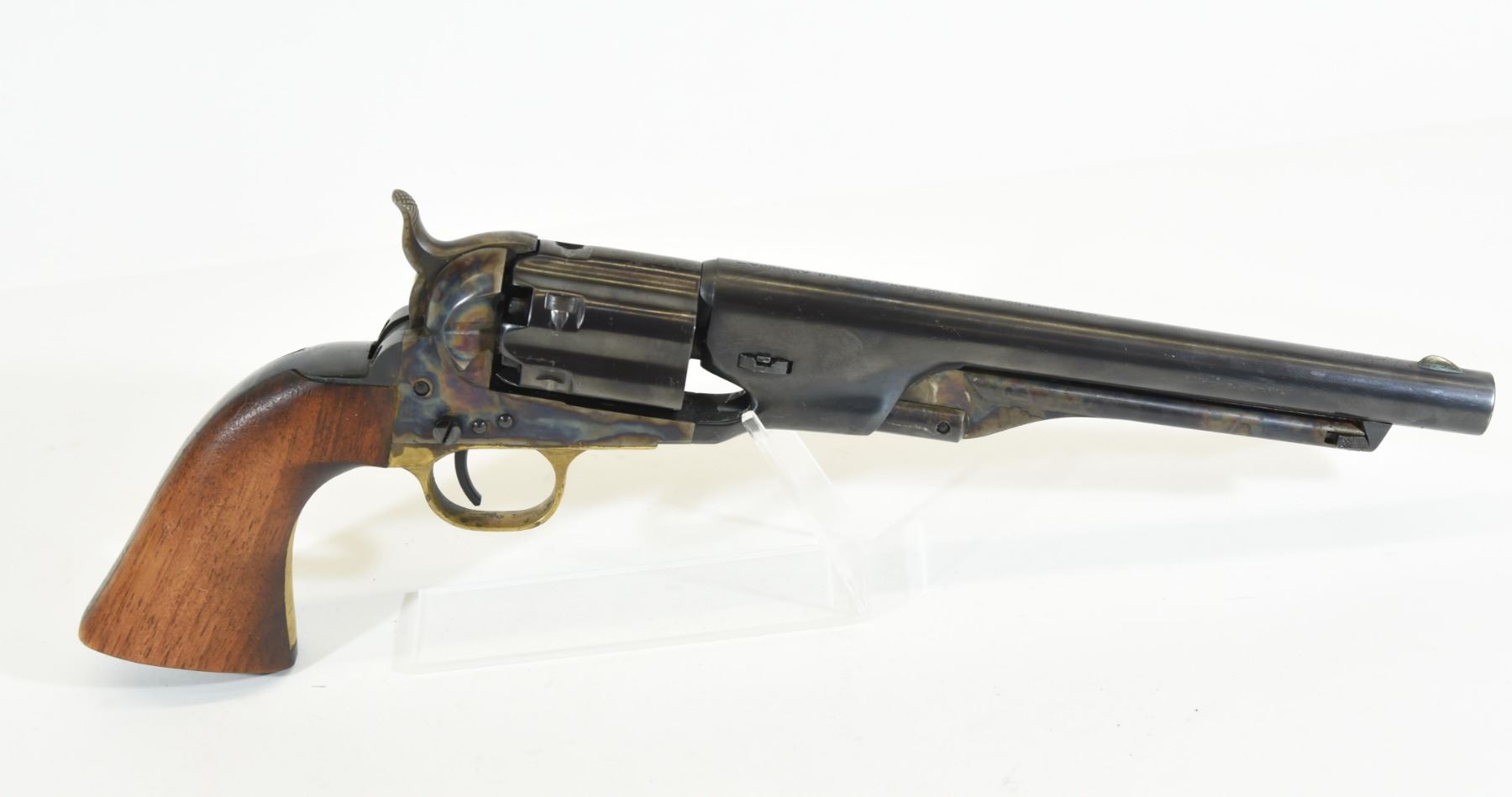 Restricted, revolver, 44 Percussion, 203mm barrel. SN 208066. Wood grips has some light marks, bluing has scratches with light pitting on cylinder, case hardening has some pitting, bore has some corrosion.