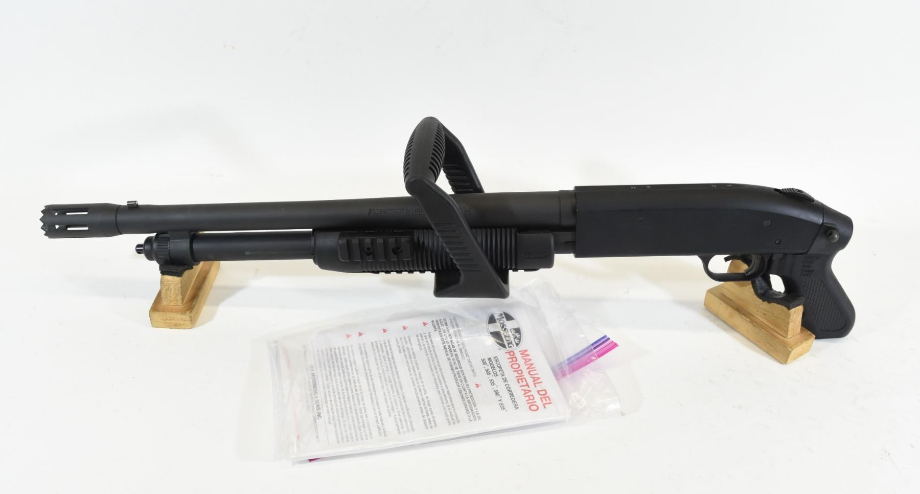 Non-Restricted, Mossberg 500 ZMB 12ga Pump Shotgun with pistol grip and chainsaw foregrip. Grips are in good condition. Bluing is fair with some small patches of wear. Bore is pitted. S/N U929556.