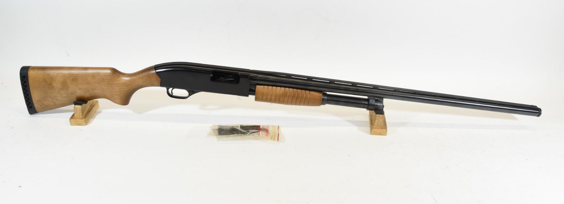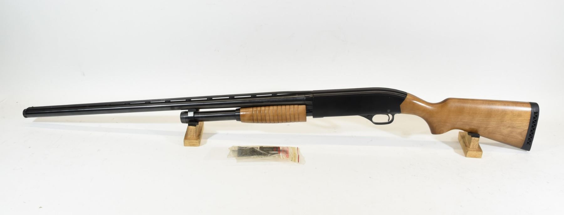 Non-Restricted, pump action, 12ga x 3", 28 1/2" barrel with removable IC choke. SN L2151986. Wood is in good condition with one dent on butt stock and one scratch on forearm, bluing is very good with a couple of pits, bore is very good. Comes with 3 chokes.