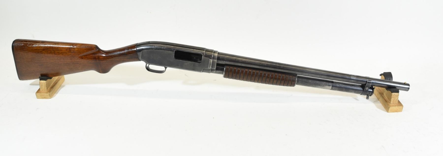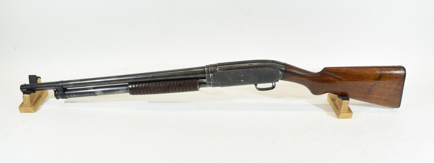 Non-restricted, pump action, 12 ga. 2 3/4", 20" open choke barrel. SN 653909. Wood has 4 cracks behind the receiver and handling marks, bluing is turning grey, bore is good, barrel has been cut down to 20".