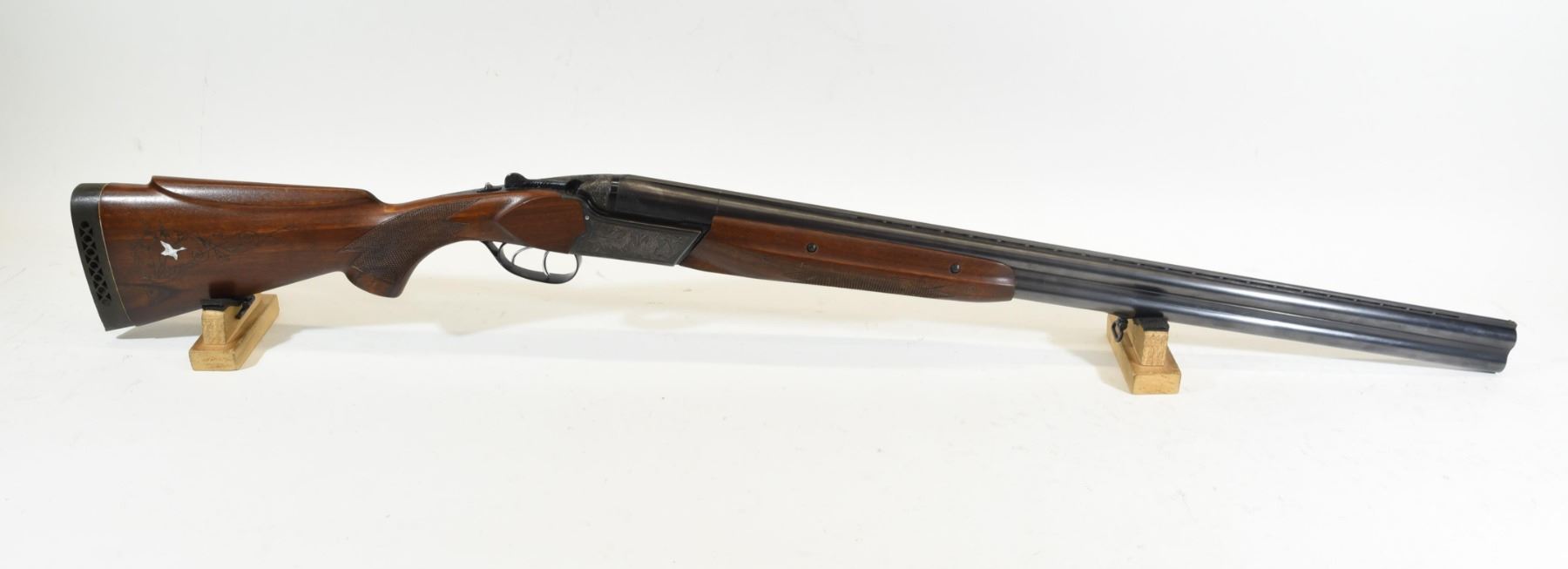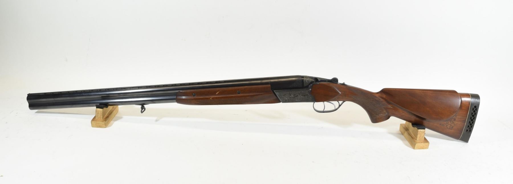 Non-restricted, multi-barrel, 12Ga x 2 3/4", 28" barrels with fixed chokes (F,M). SN N1787. Wood has a mark in forearm, bluing good, bores excellent. Nice engraving and inlays.