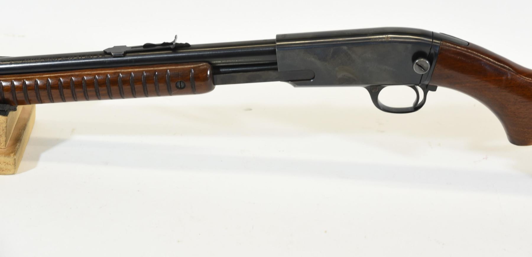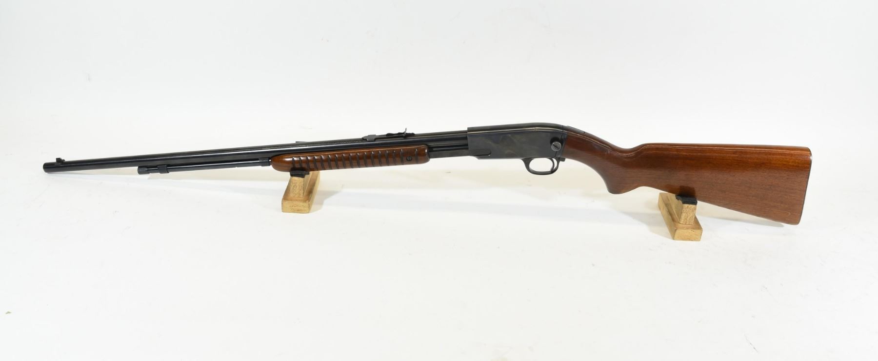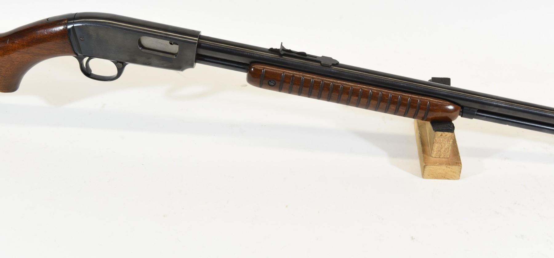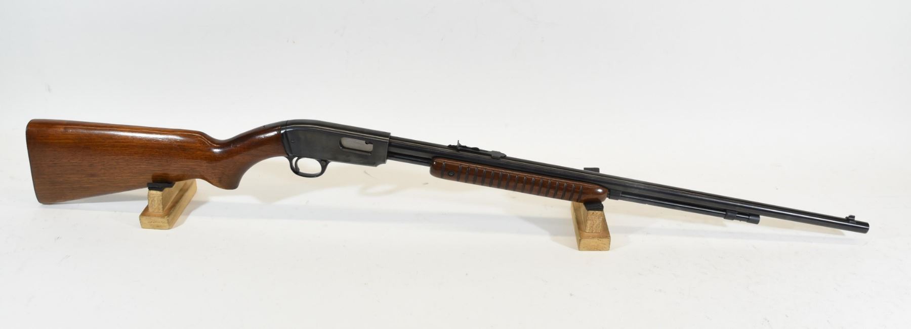 Non-restricted, pump action, 22LR, 24" barrel. SN 102587. Wood has a couple of marks, bluing has a pit mark, bore excellent.