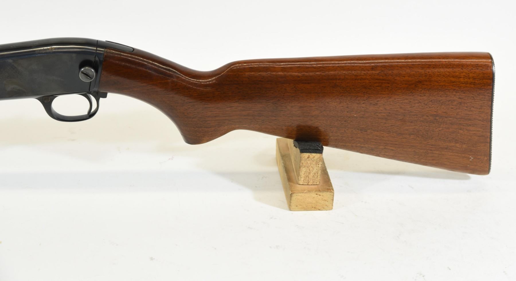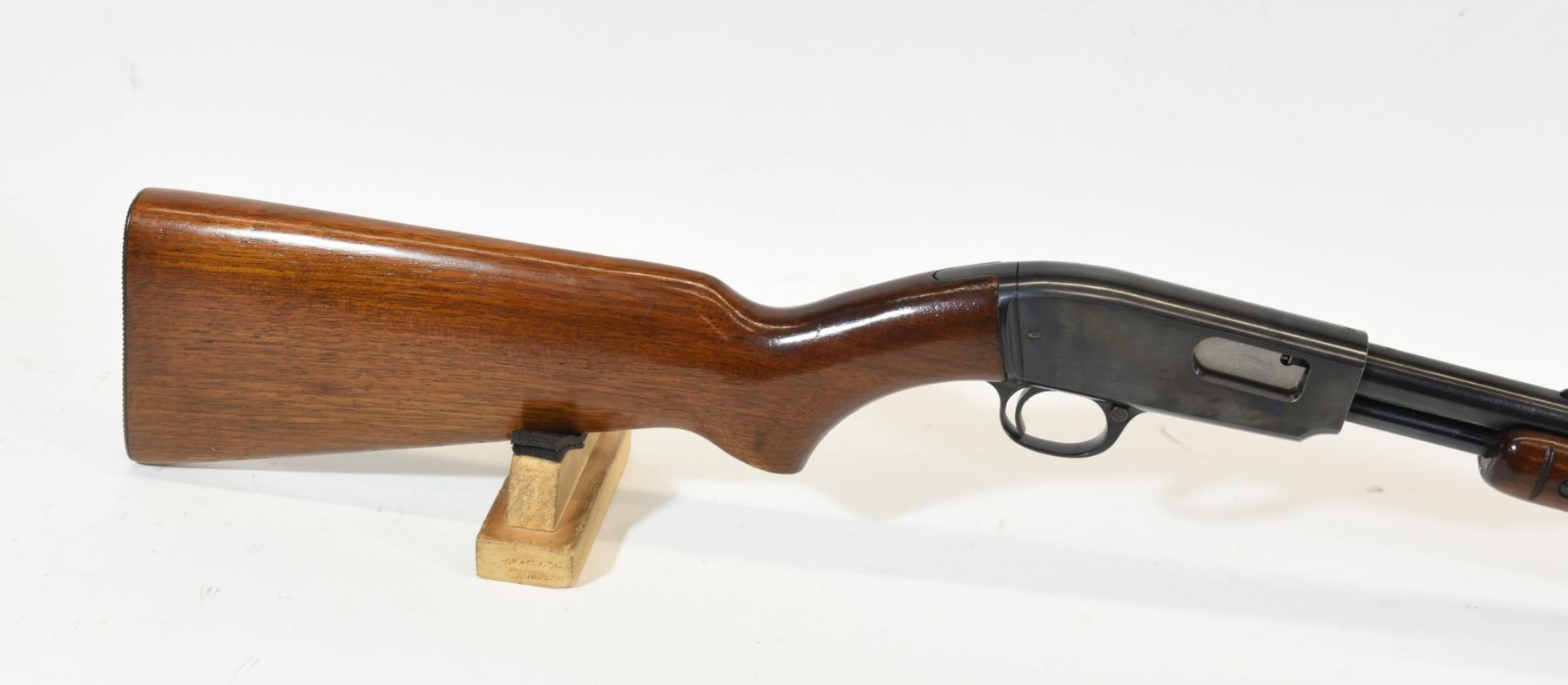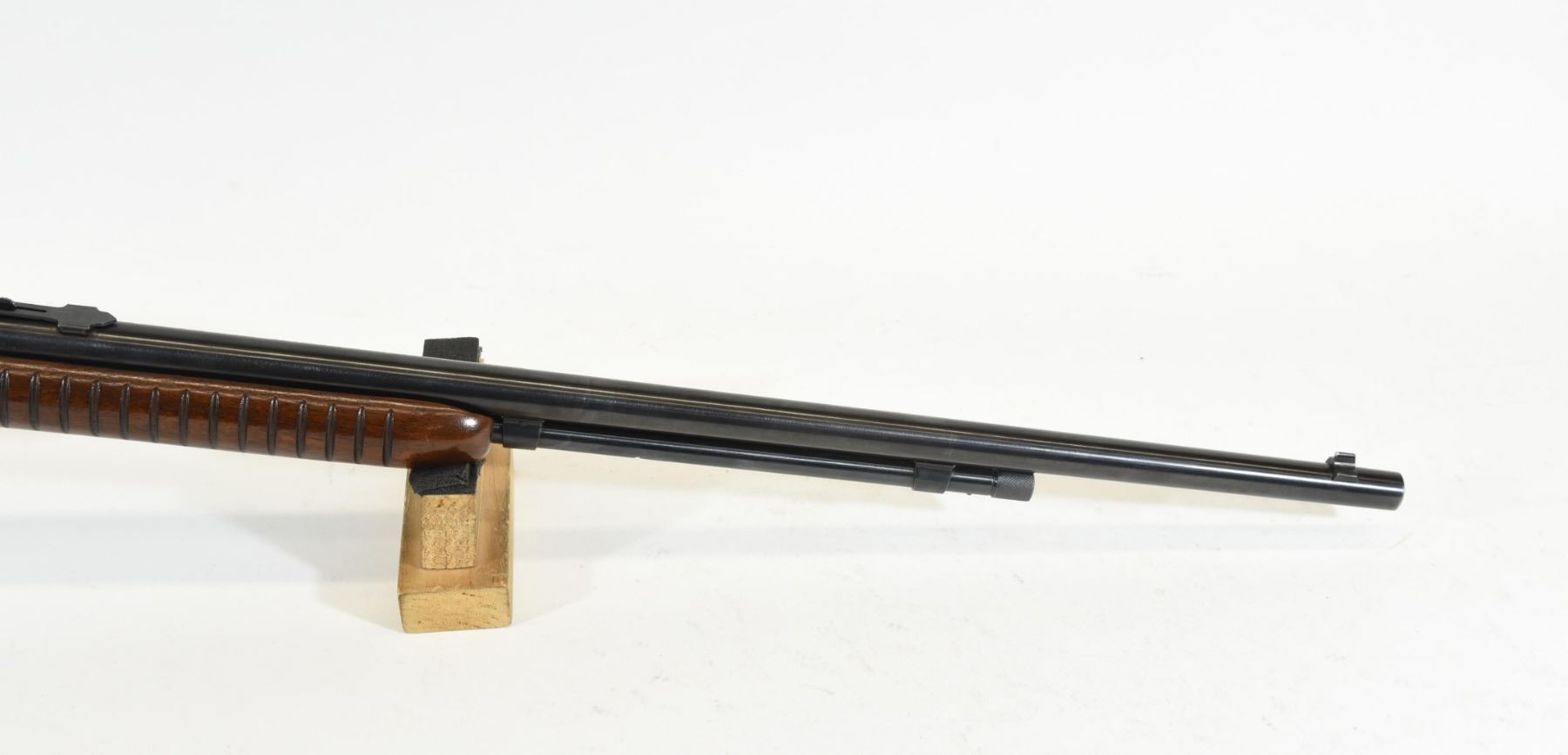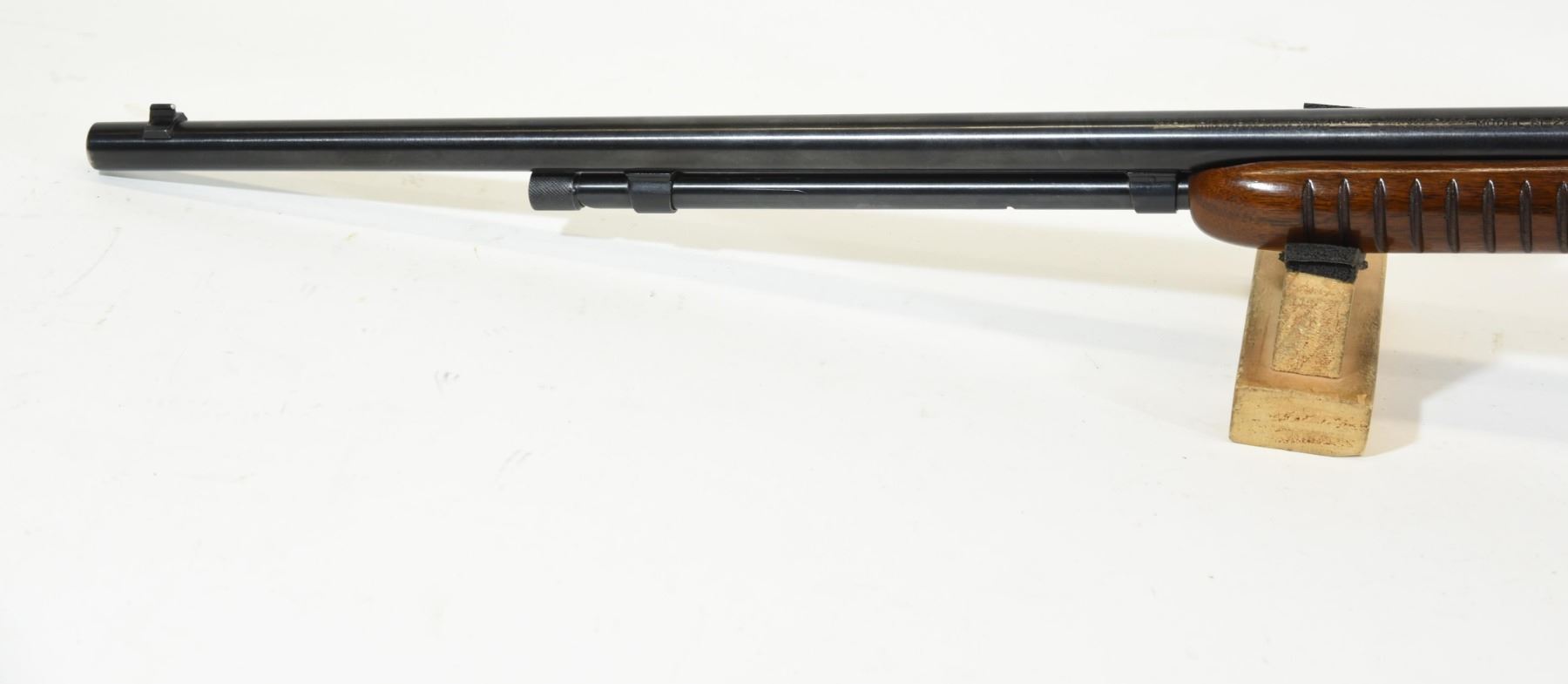 Non-restricted, pump action, 22LR, 24" barrel. SN 102587. Wood has a couple of marks, bluing has a pit mark, bore excellent.