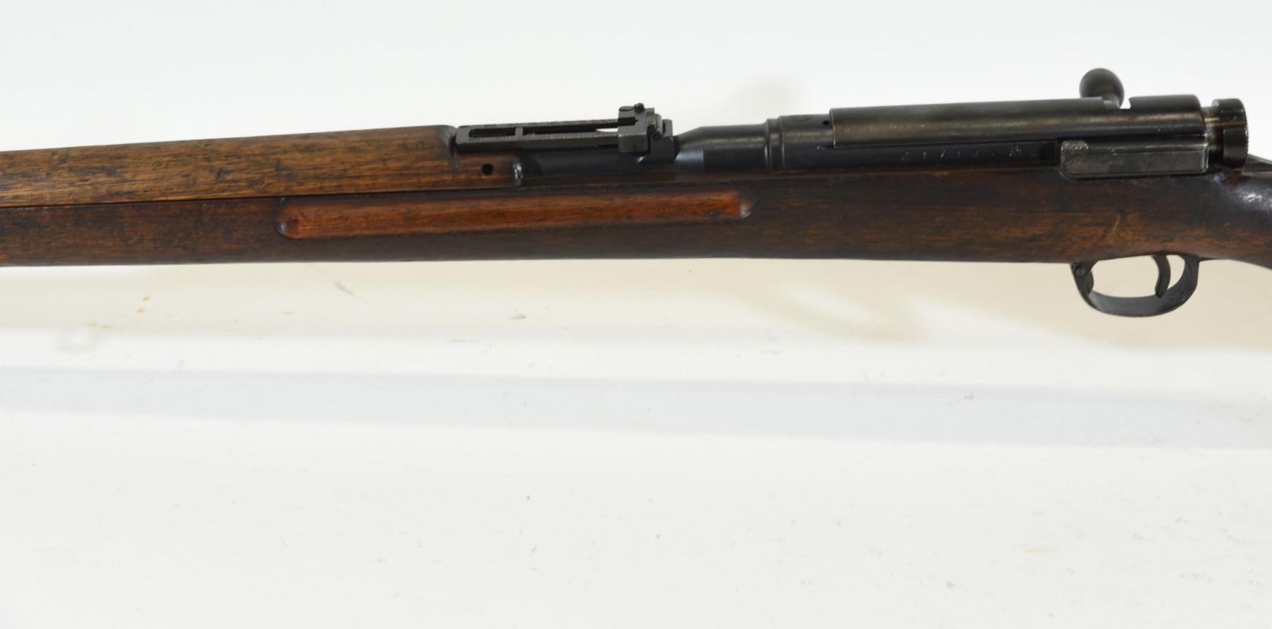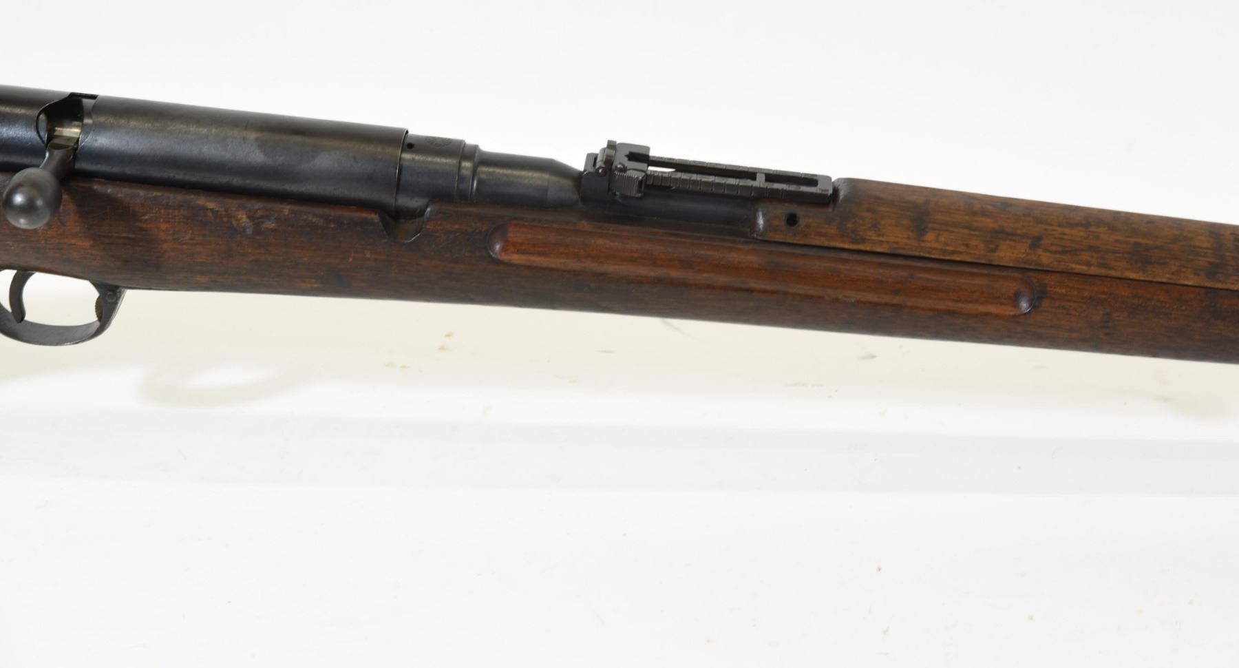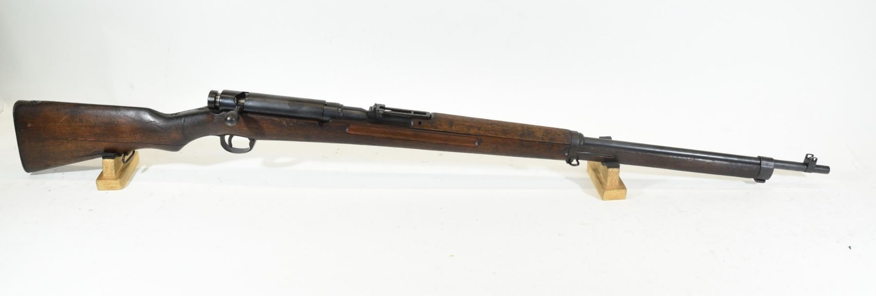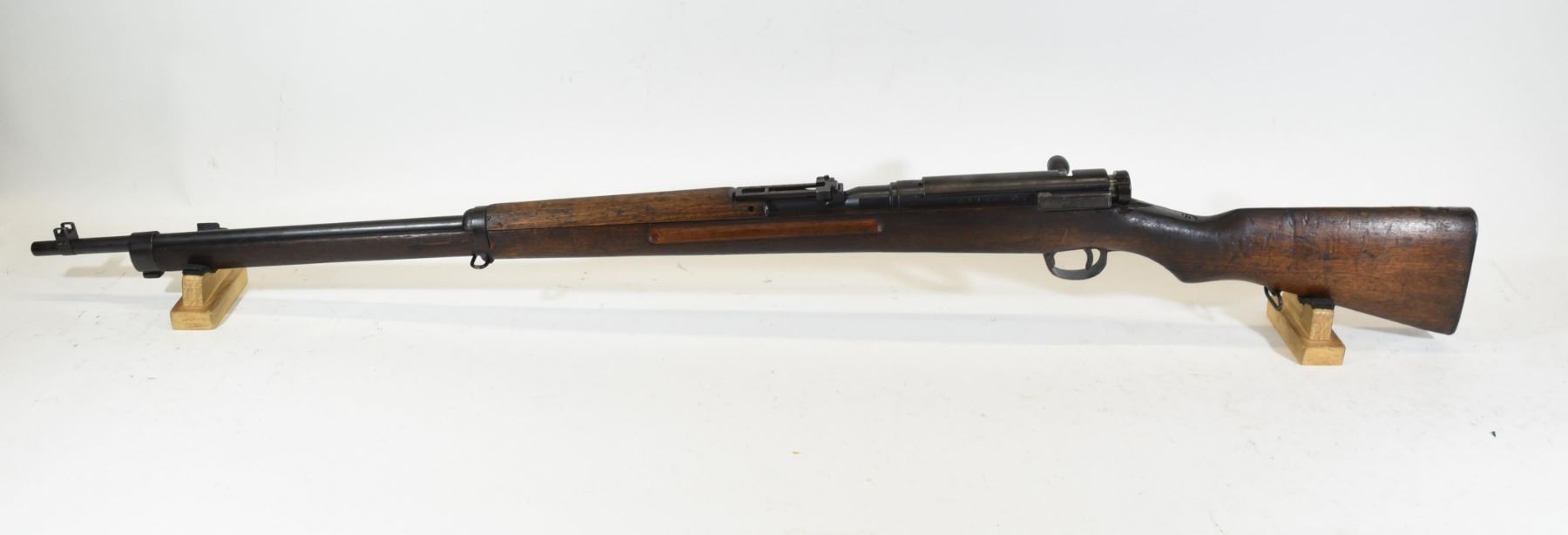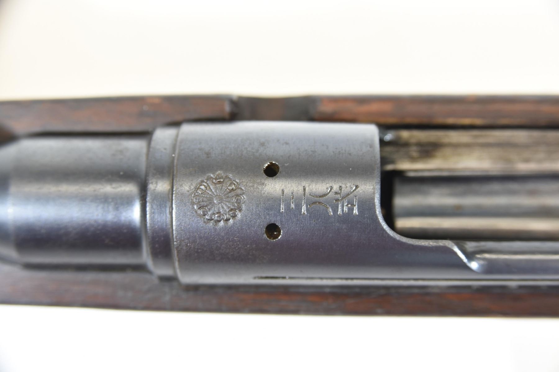 Non-restricted, bolt action, 6.5 x 50SR, 31" barrel. SN 17034. Wood has dents, gouges and scratches, bluing grey and turning brown, bore dark from corrosion, rifling evident. Chrysanthemum on receiver. No cleaning rod or bayonet.