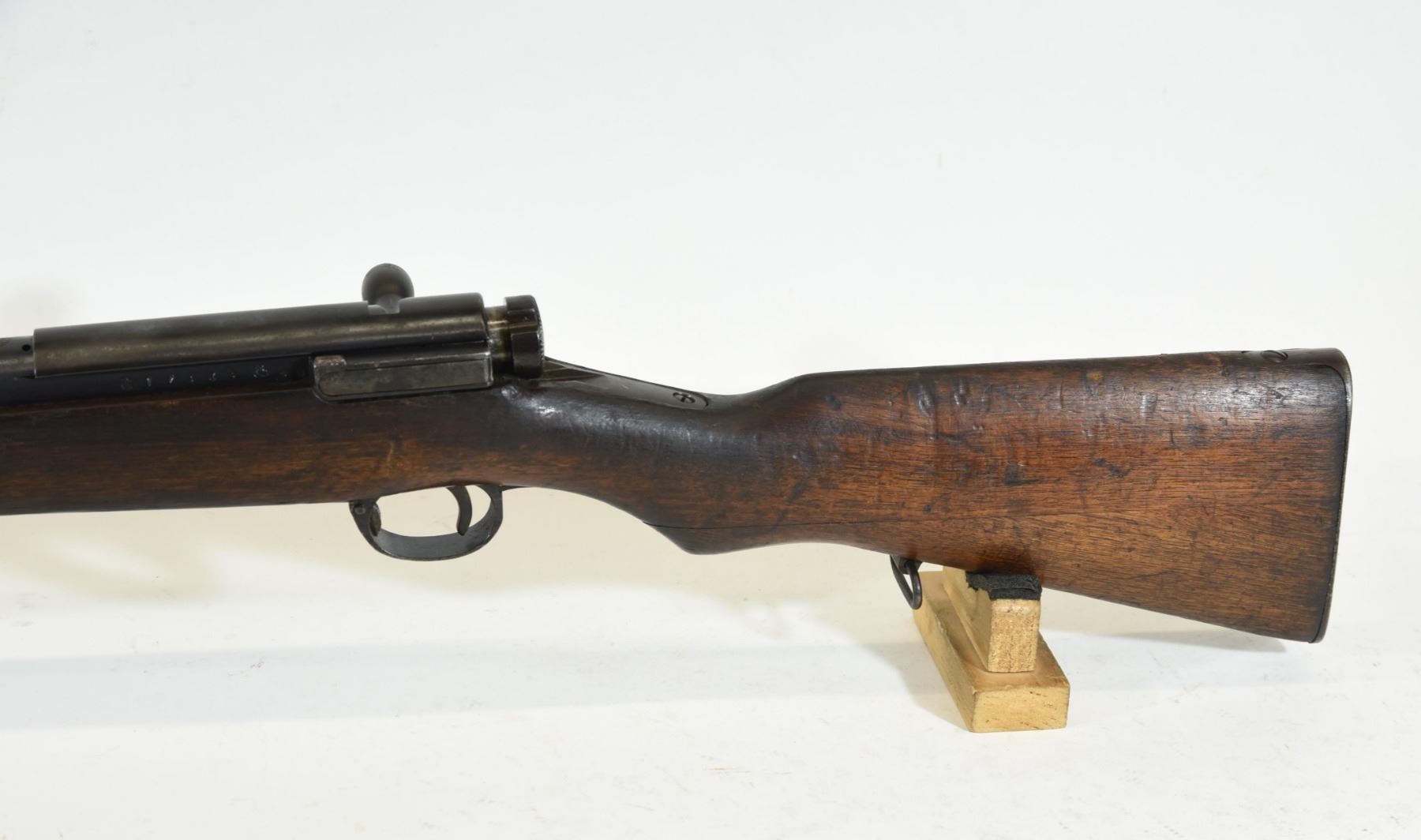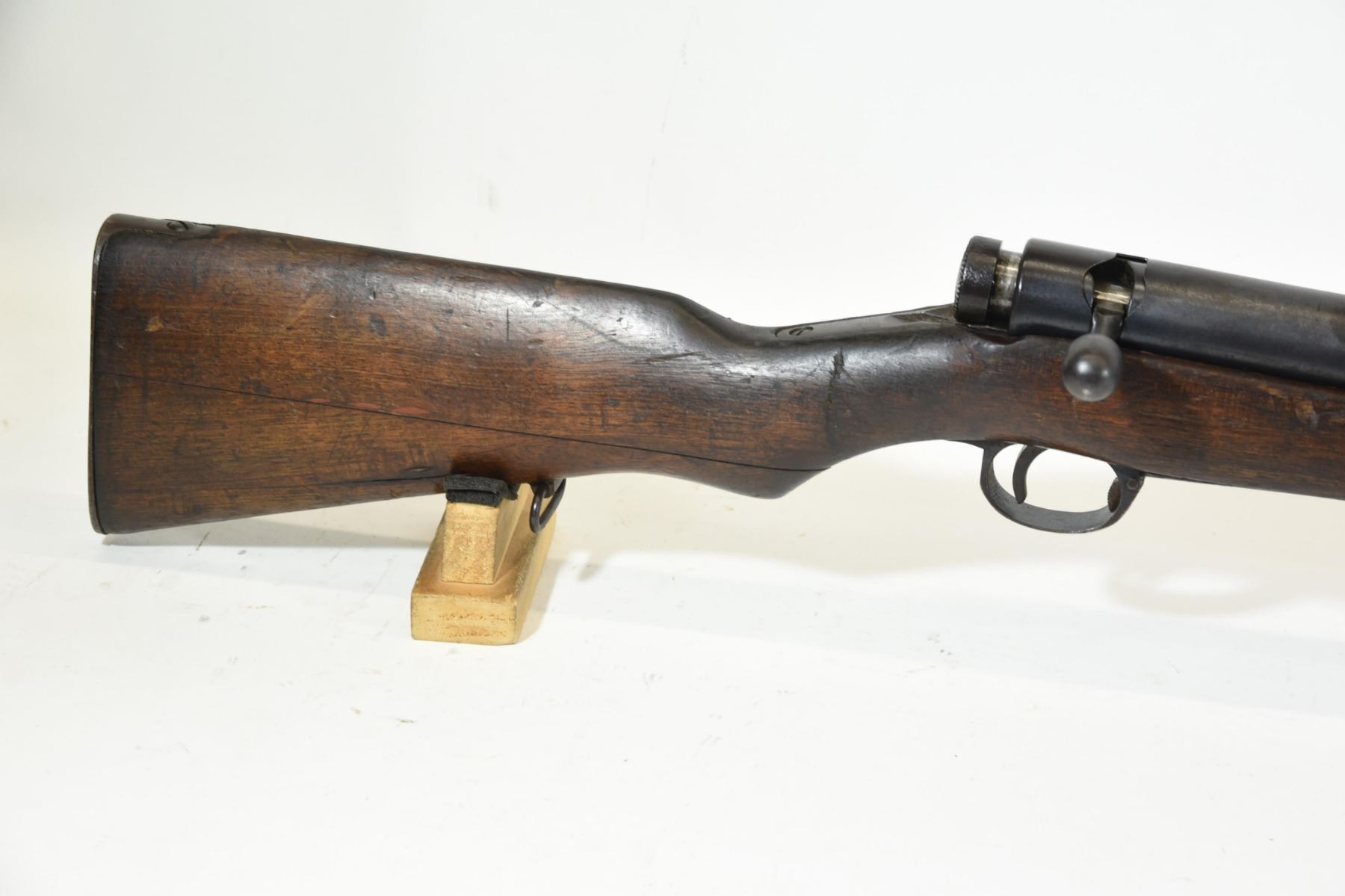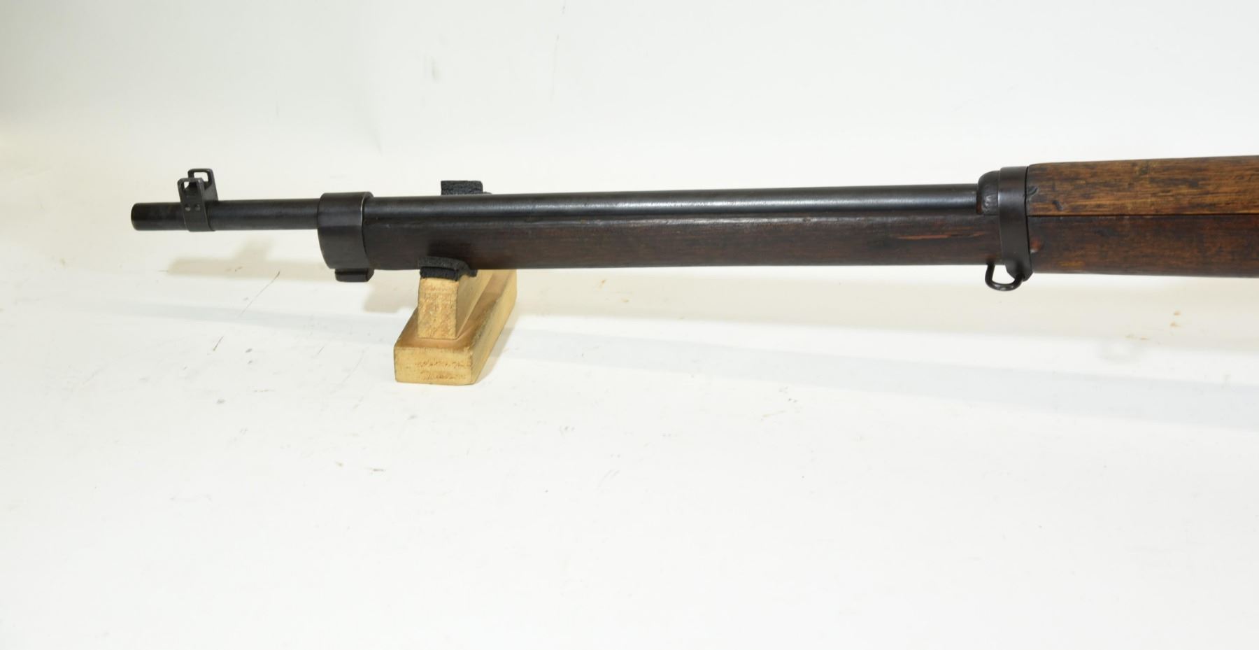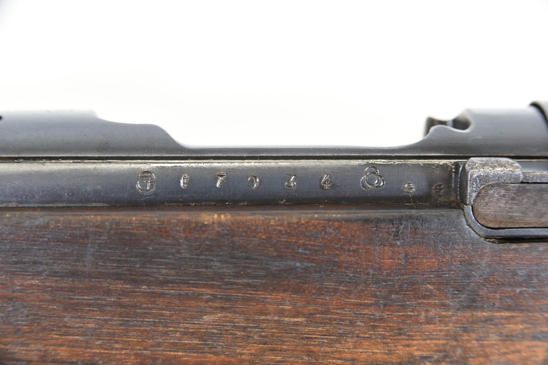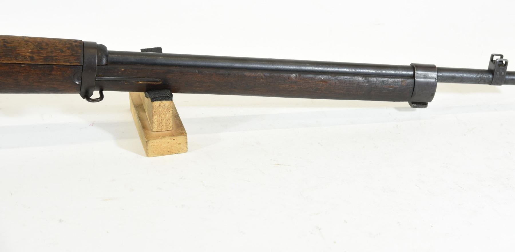 Non-restricted, bolt action, 6.5 x 50SR, 31" barrel. SN 17034. Wood has dents, gouges and scratches, bluing grey and turning brown, bore dark from corrosion, rifling evident. Chrysanthemum on receiver. No cleaning rod or bayonet.