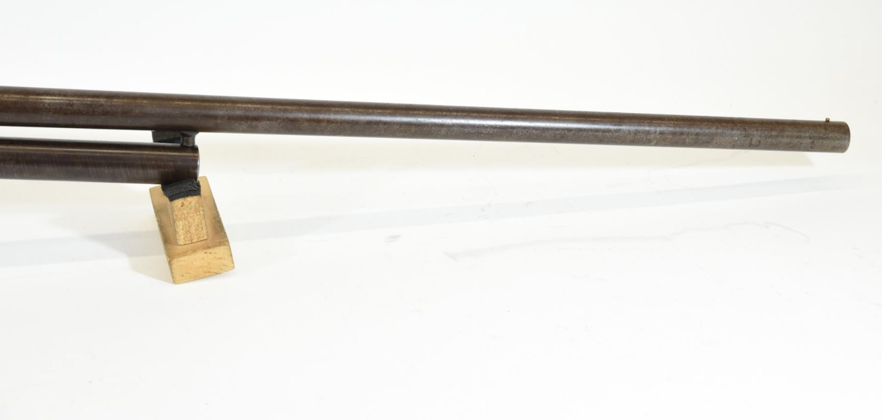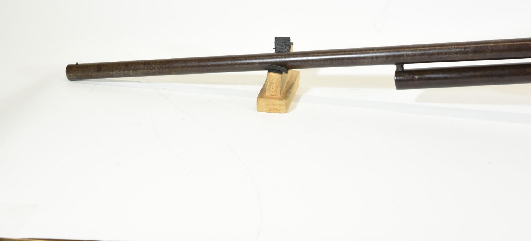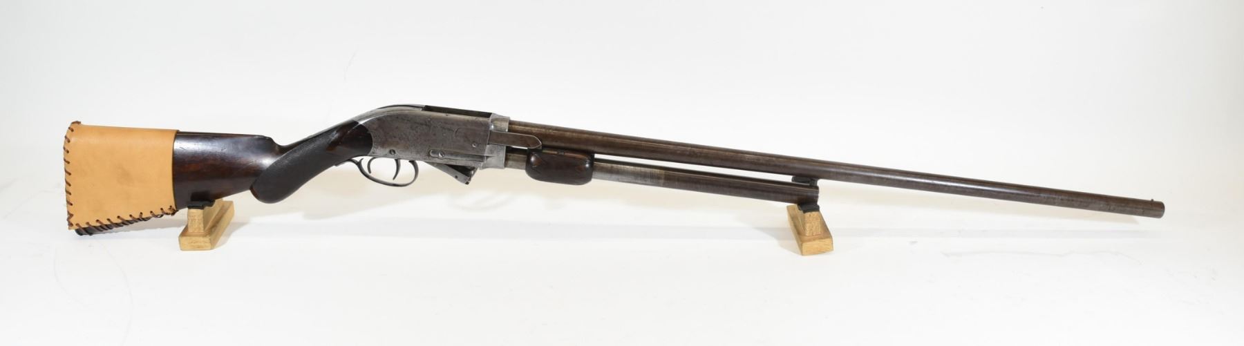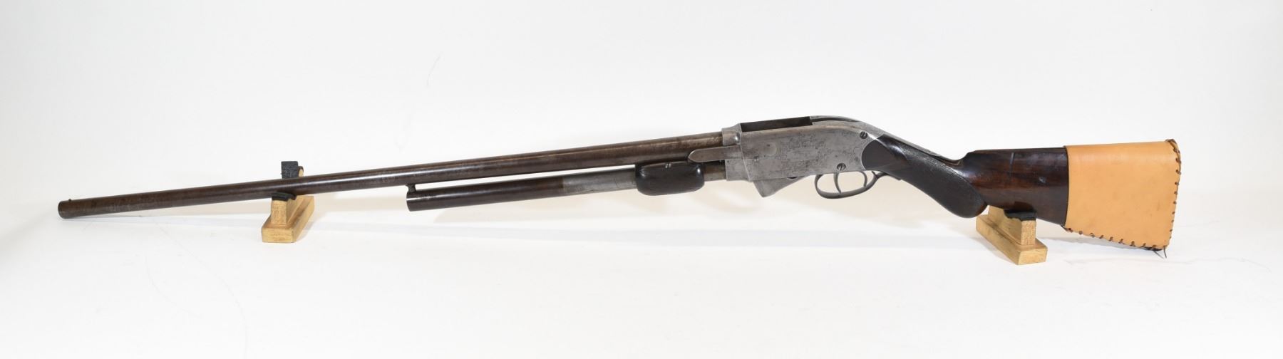 Non-restricted, pump action, 12Ga x 2 5/8, 32" Damascus barrel. SN 782. Wood has dents and scratches, bluing is brown, bore pitted. Patent date 1882 stamped on barrel.