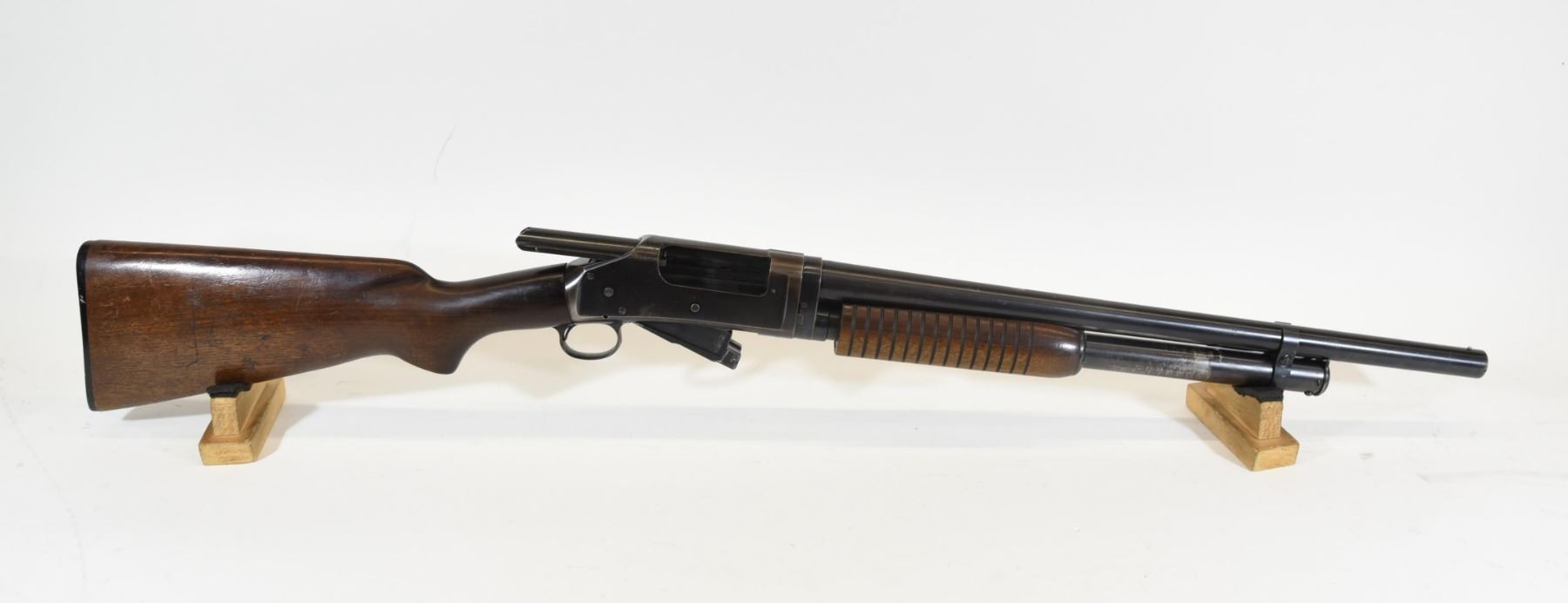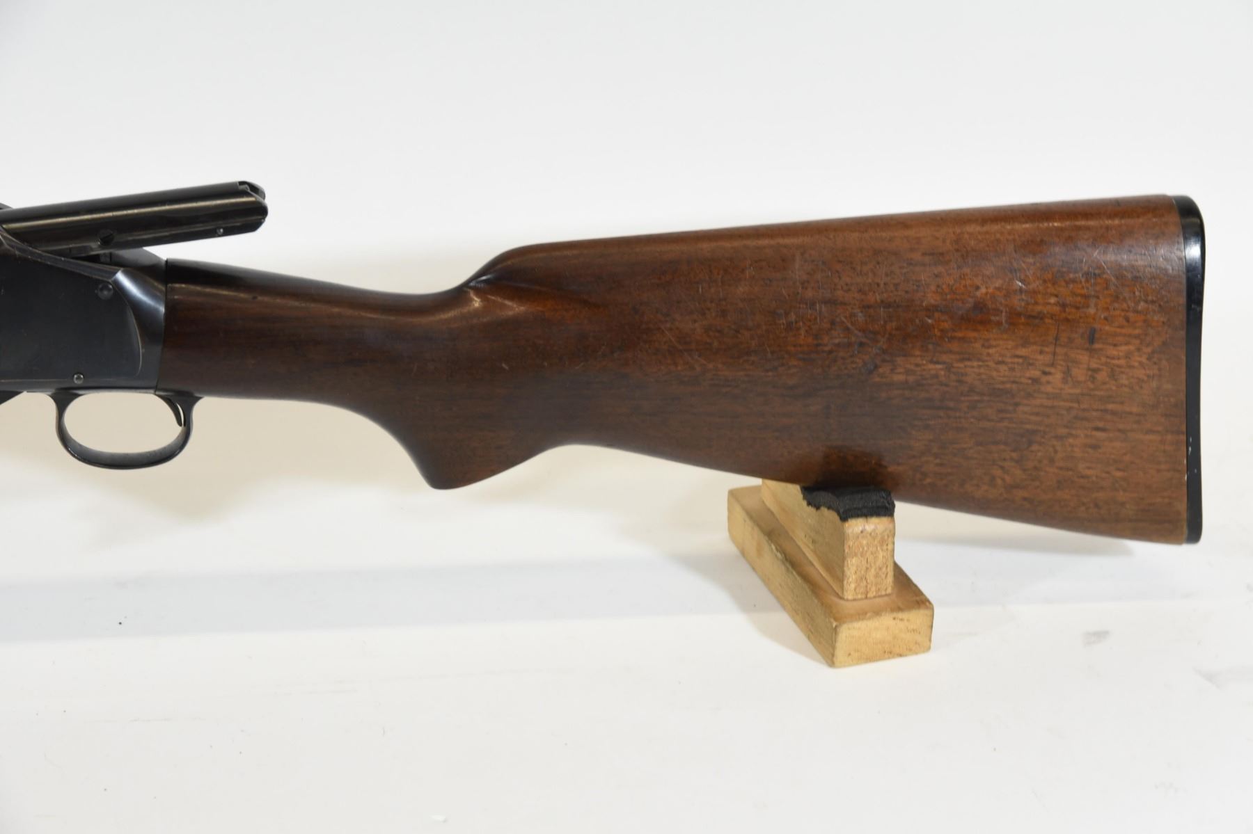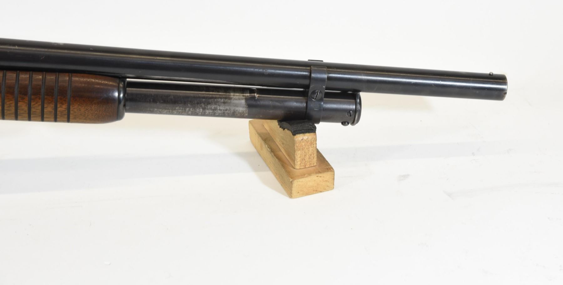 Non-restricted, pump action, 12Ga x 2 3/4", 20 3/4" barrel with fixed cylinder choke. SN 1001536. Wood has numerous light scratches and a few dents, bluing turning brown, bore good. Manufactured in 1955.
