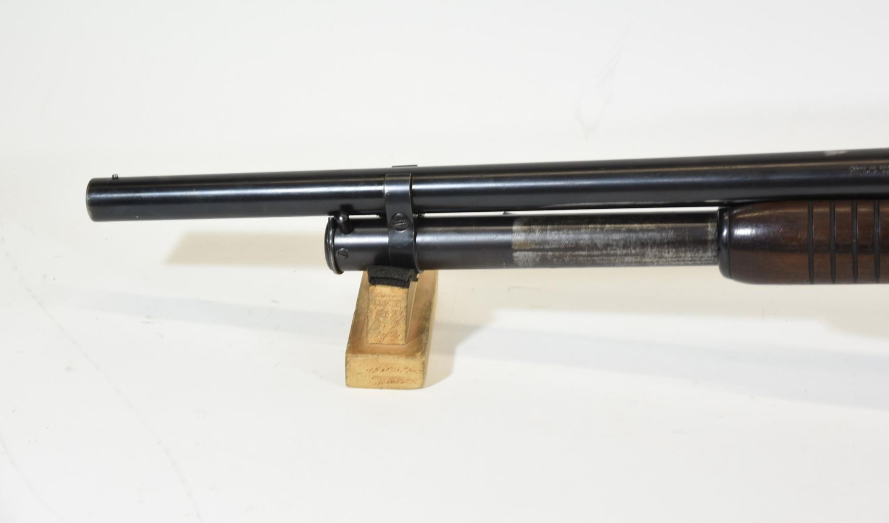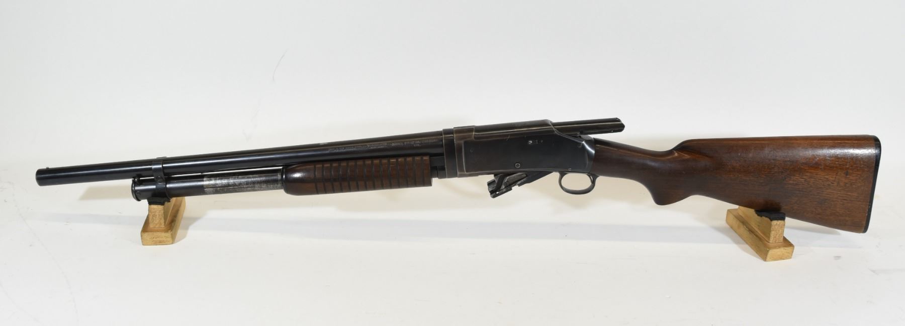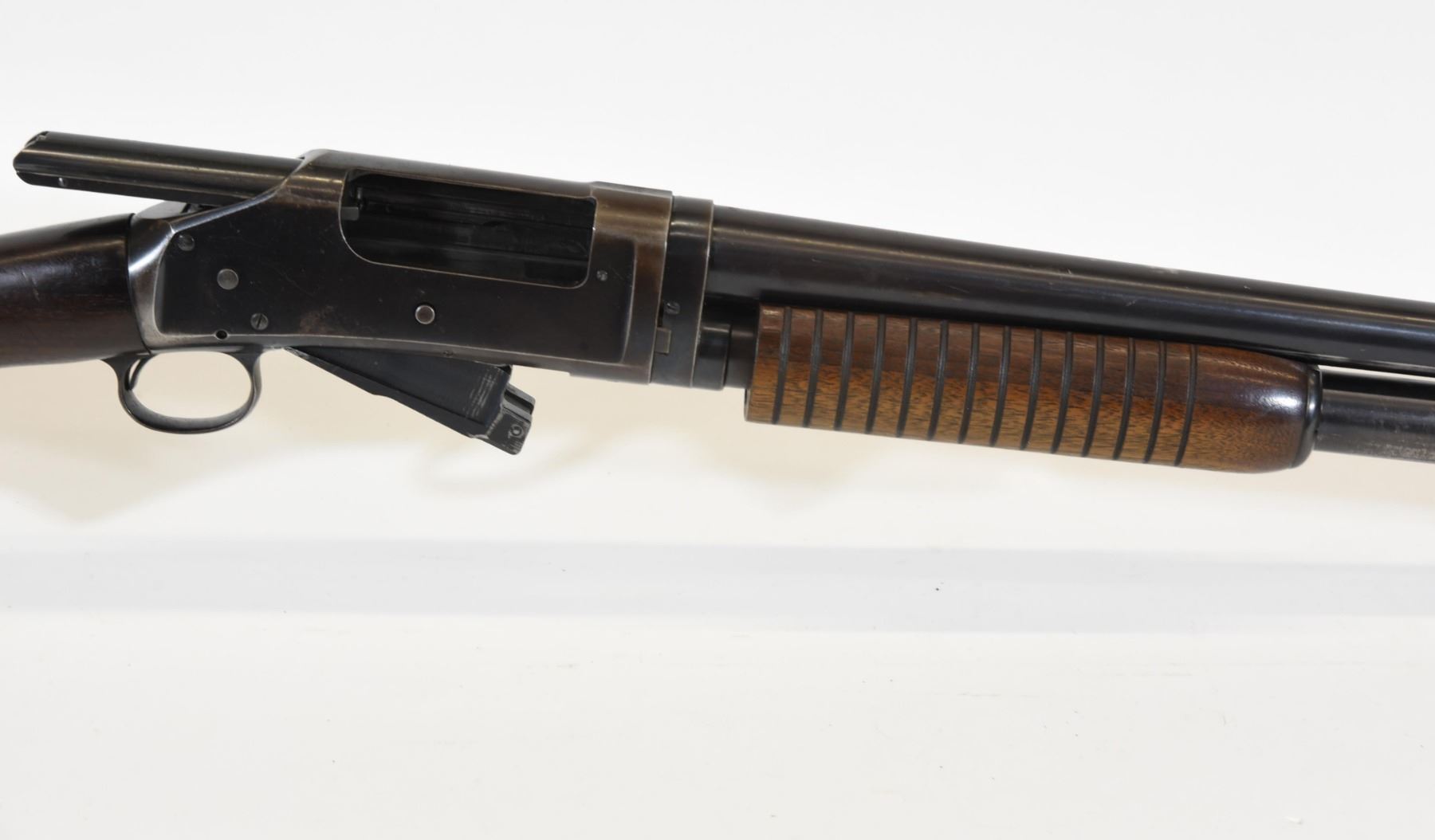 Non-restricted, pump action, 12Ga x 2 3/4", 20 3/4" barrel with fixed cylinder choke. SN 1001536. Wood has numerous light scratches and a few dents, bluing turning brown, bore good. Manufactured in 1955.
