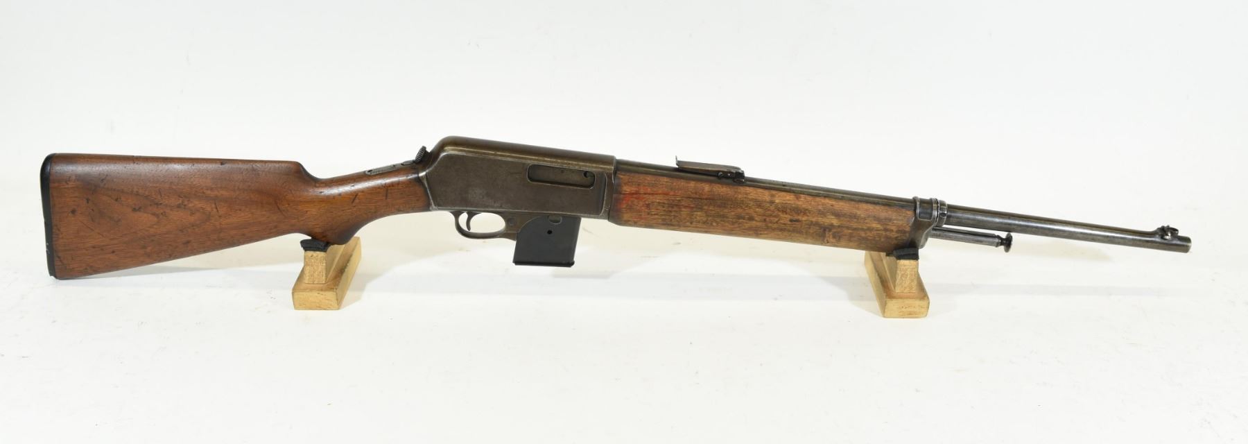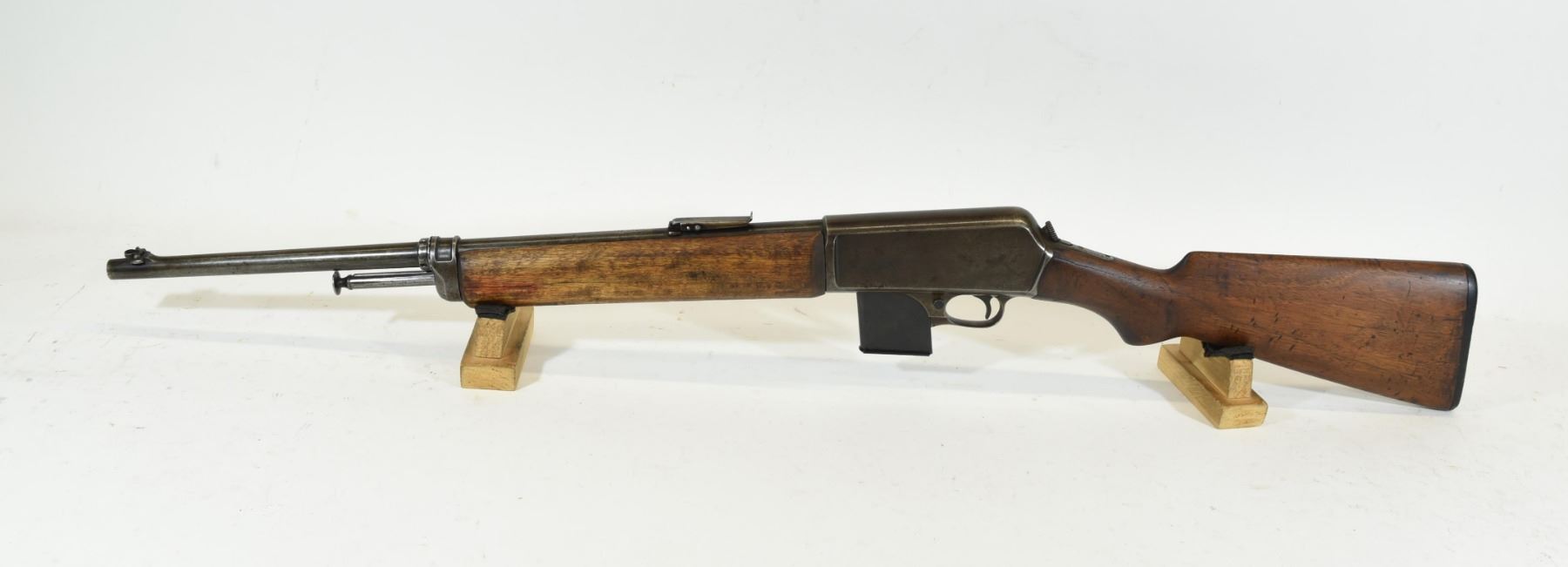 Non-restricted, semi-auto, 351 cal. 20" barrel. SN 2323. Wood has a number of light marks and 3 cracks in the butt stock where it meets the receiver, and about 4 visible cracks in the fore stock, bluing is turning grey, bore is dark rifling prominent.