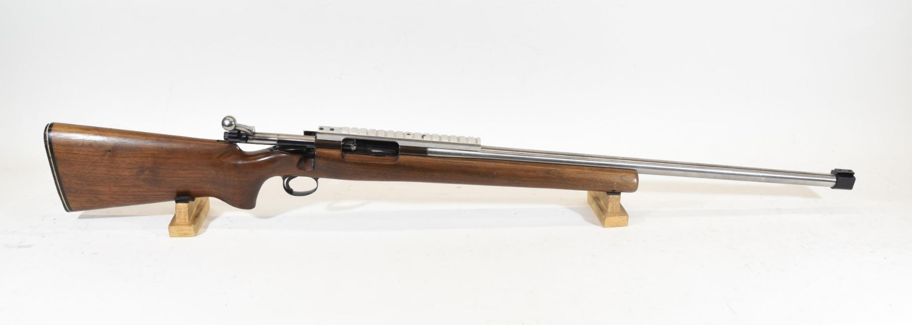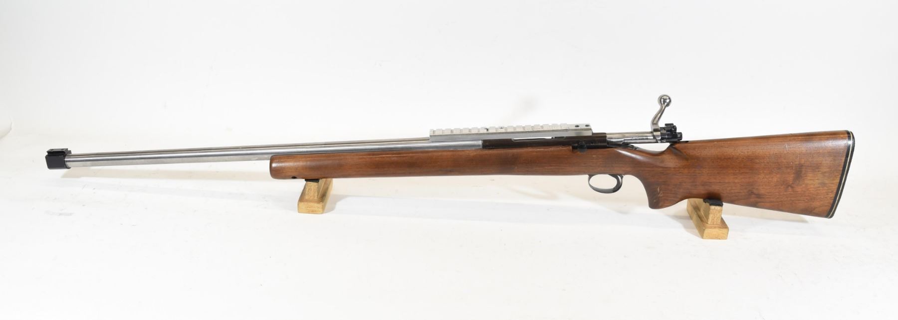 Non-restricted, bolt action, 223 cal., 26" barrel. SN 2772. Wood has handling marks, stainless barrel in good condition, bore is excellent, has a barrel weight and a scope rail.
