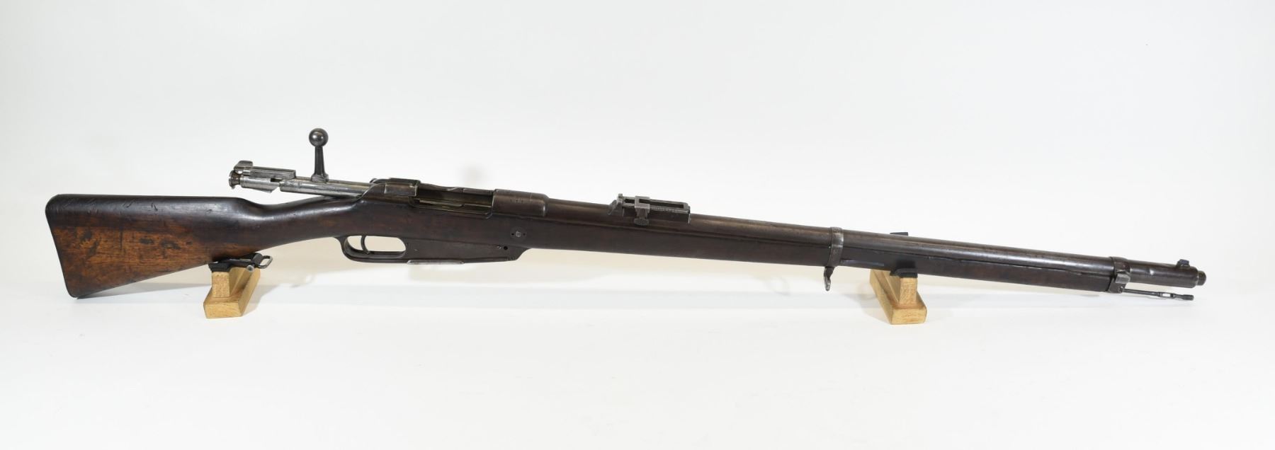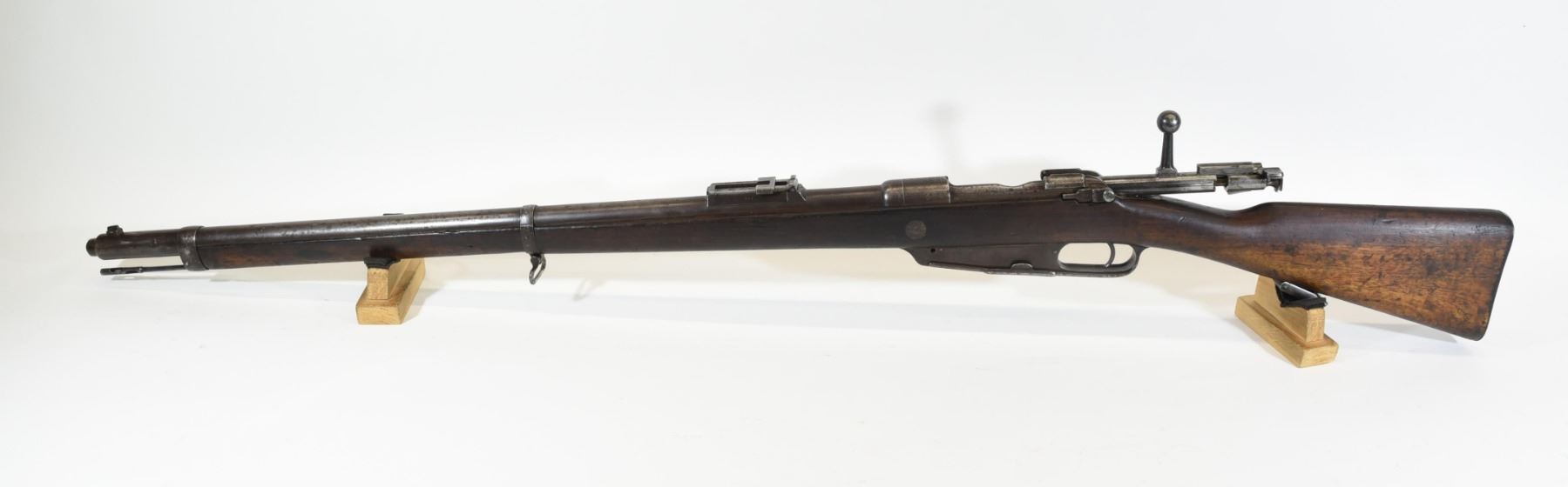 Non-restricted, bolt action, 8mm Mauser, 29" barrel. SN 56 11. Wood has numerous dents and marks, bluing is grey/brown, bore is dark rifling prominent.not matching numbers bolt is 2735