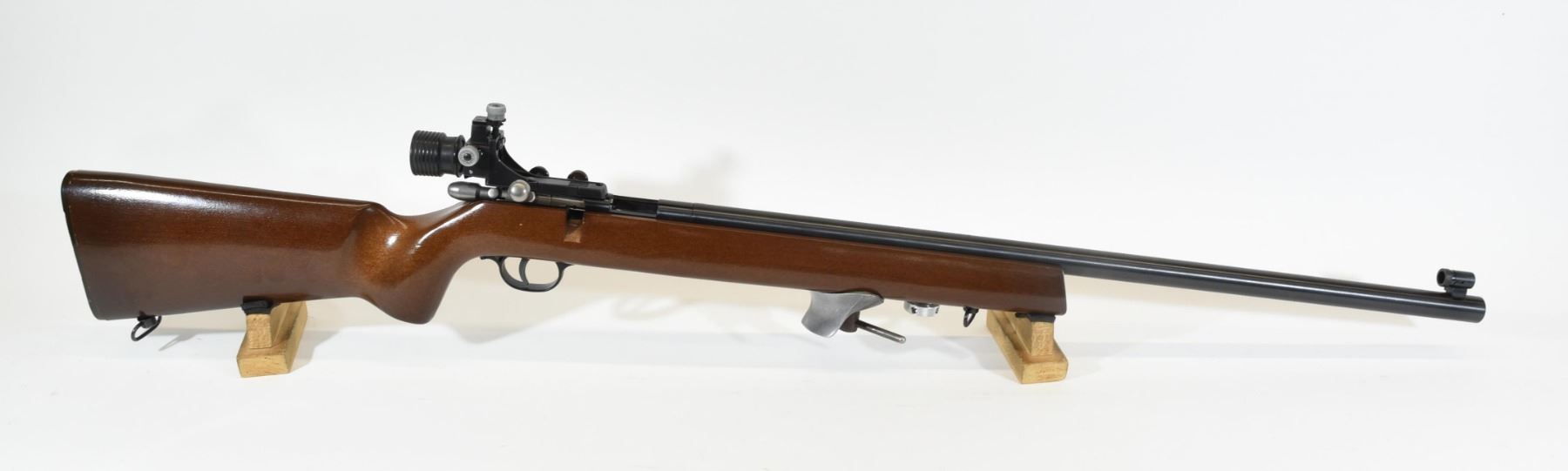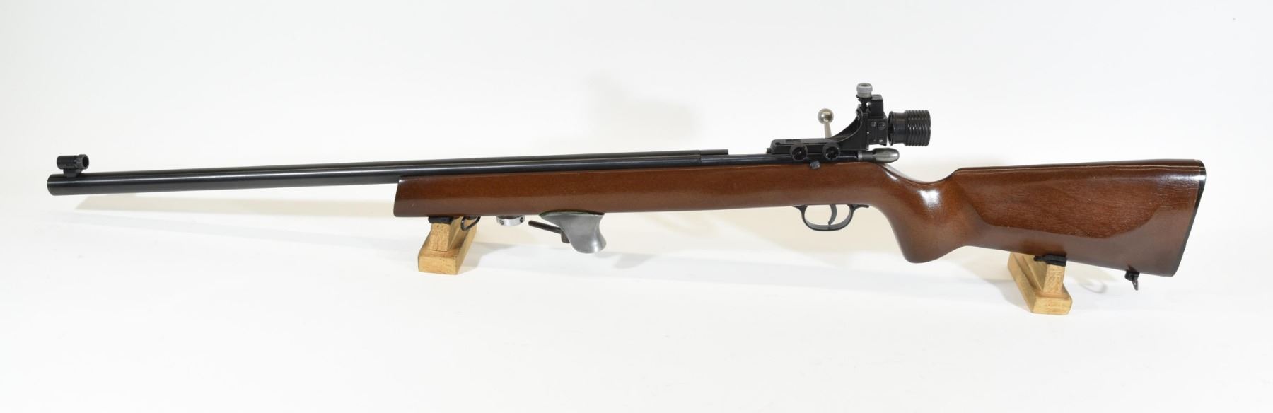 Non-restricted, bolt action, 22 lr, 26" heavy barrel. SN D699836. Wood is very good, bluing is excellent, bore is excellent, comes with an Anschutz peep sight.