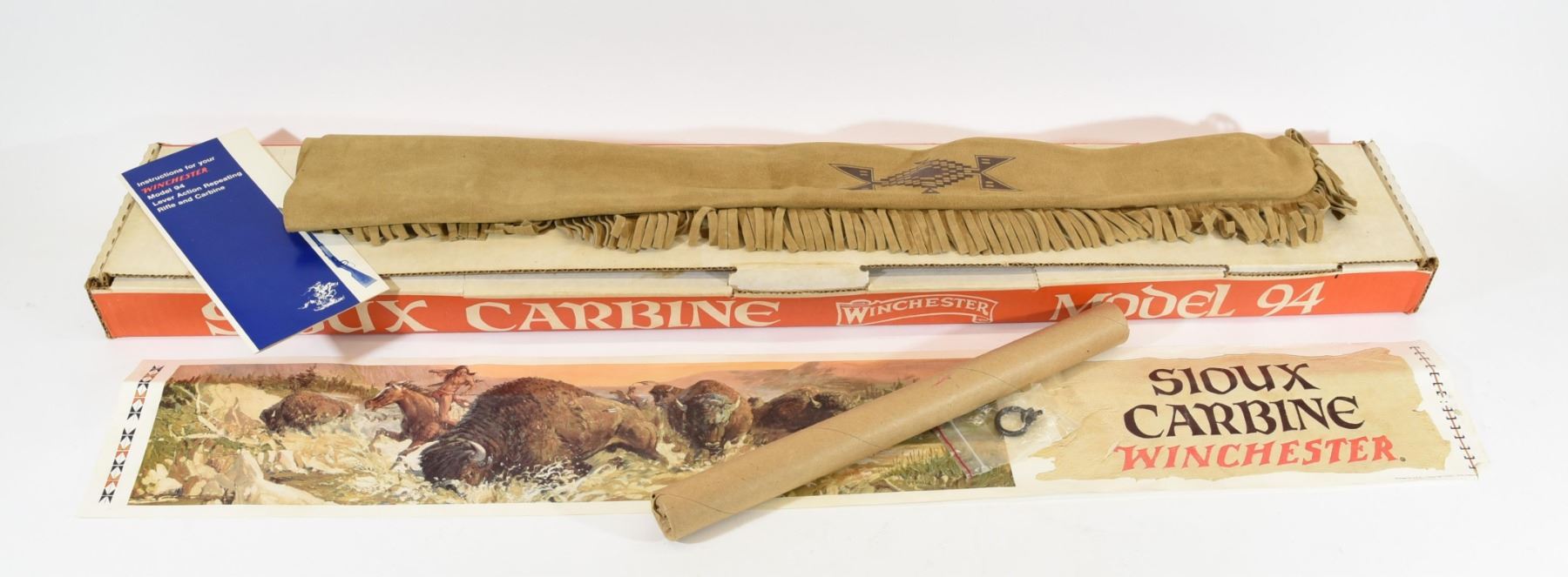 Non-restricted, lever action, 30-30 win., 20" barrel. SN SU11559. Wood is very good with 3 minor nicks, bluing has a few spots of light surface rust, receiver has a little tarnish on it, bore is excellent, unfired, comes in original box with leather scabbard, poster in cardboard tube and saddle ring, also has manual.