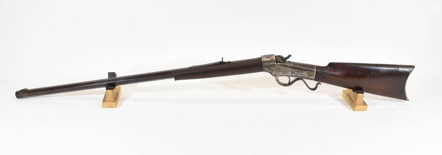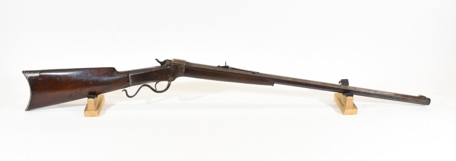 Antique, single shot, Cal. 32 long rim fire, 28" octagonal barrel. SN 23599. Wood has a couple of fine cracks at the receiver and a couple dents and light scratches, bluing is brown, bore is a little dark but good.