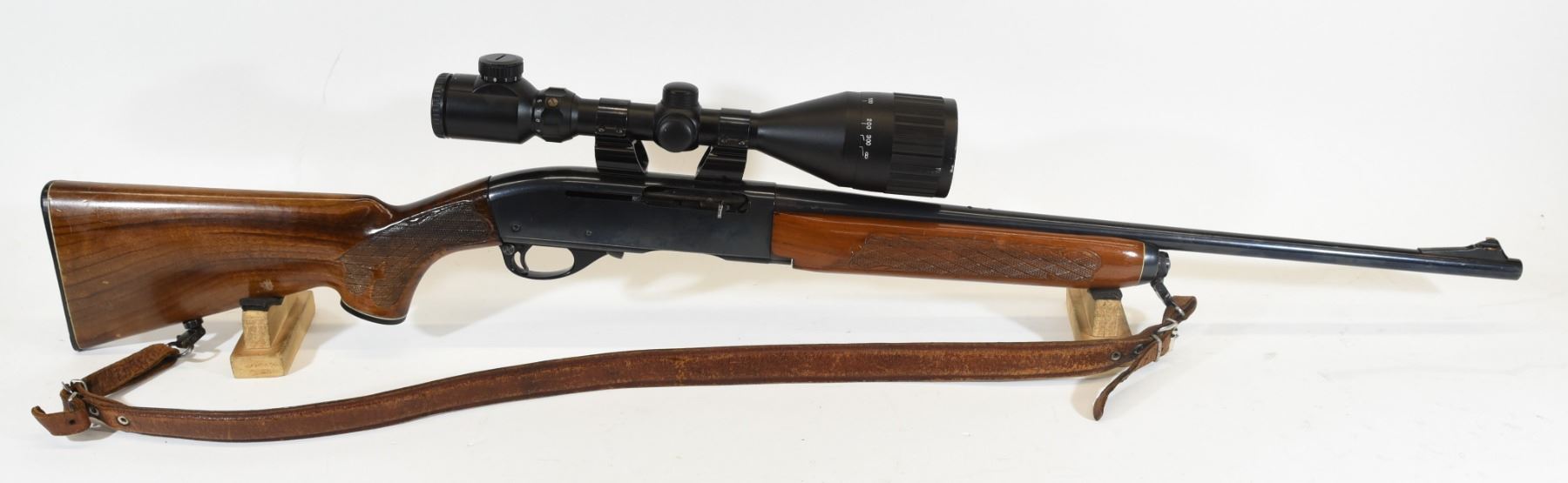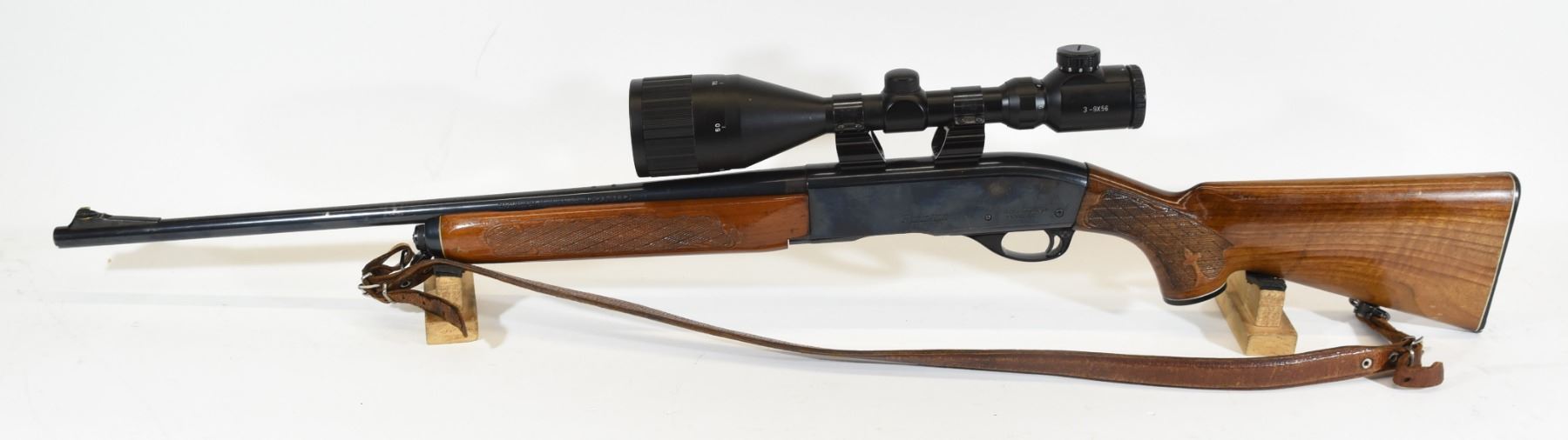 Non-restricted, semi-auto, 30-06 sprg., 22" barrel. SN 7429907. Wood has handling marks and some light scratches, bluing is showing grey in a few spots , bore is very good, comes with a leather sling and a 3-9x56 unknown scope.