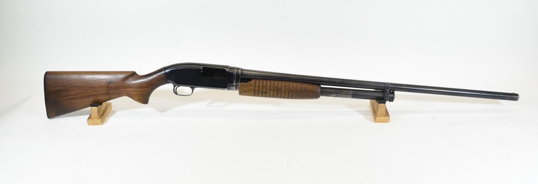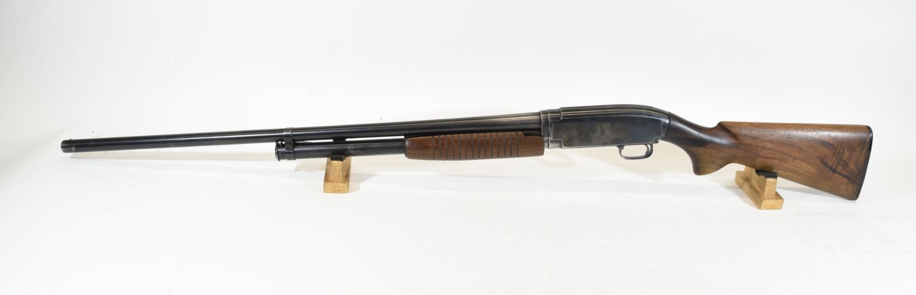 Non-restricted, pump action, 12Ga x 2 3/4", 30" barrel with fixed full choke. SN 1747039. Wood has some chips in forearm, bluing is grey and worn, bore good.