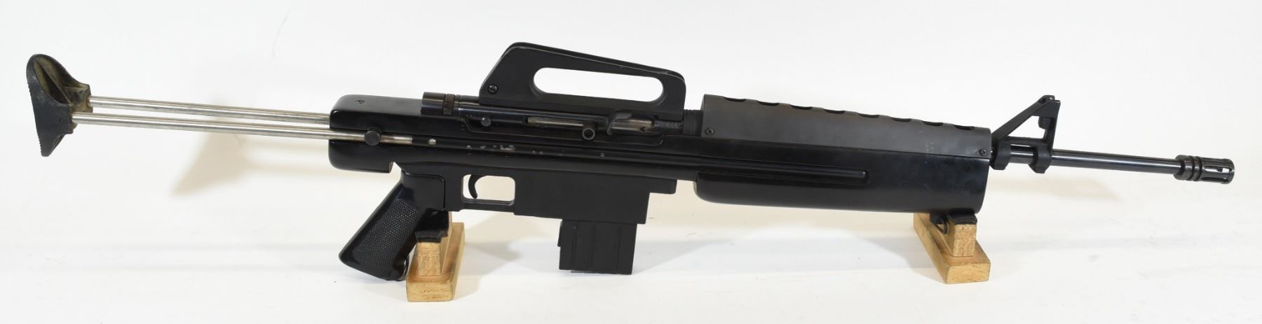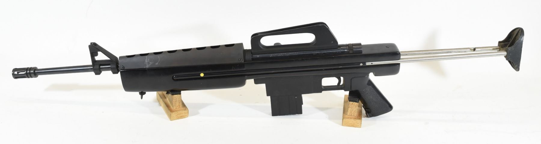 Non-restricted, semi-auto, 22 lr, 18" barrel. SN A421895. Synthetic stock has handling marks, bluing is good on barrel, bore is excellent, paint is chipping on stock slide.