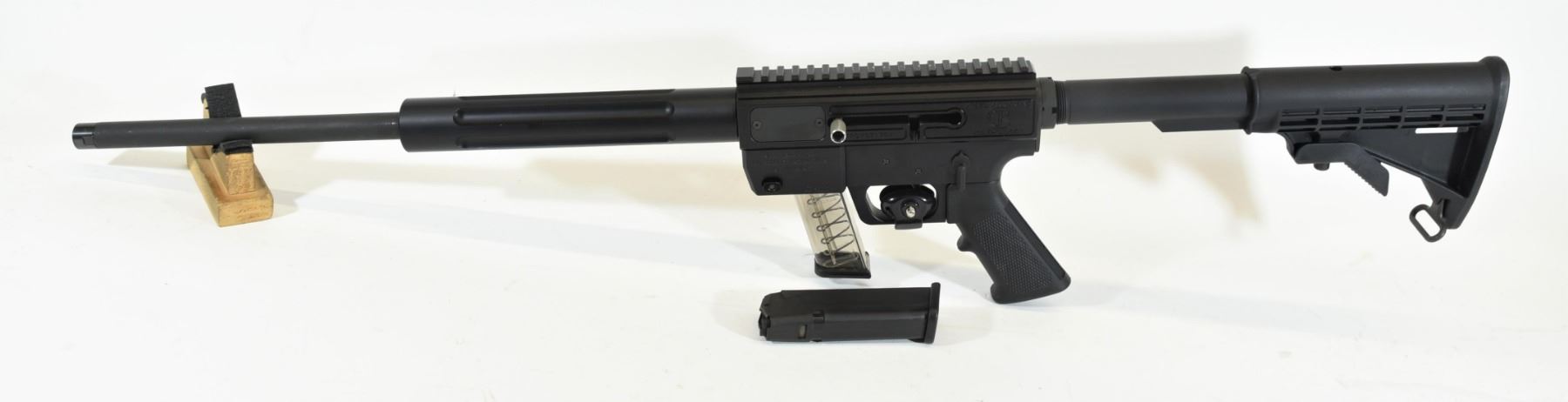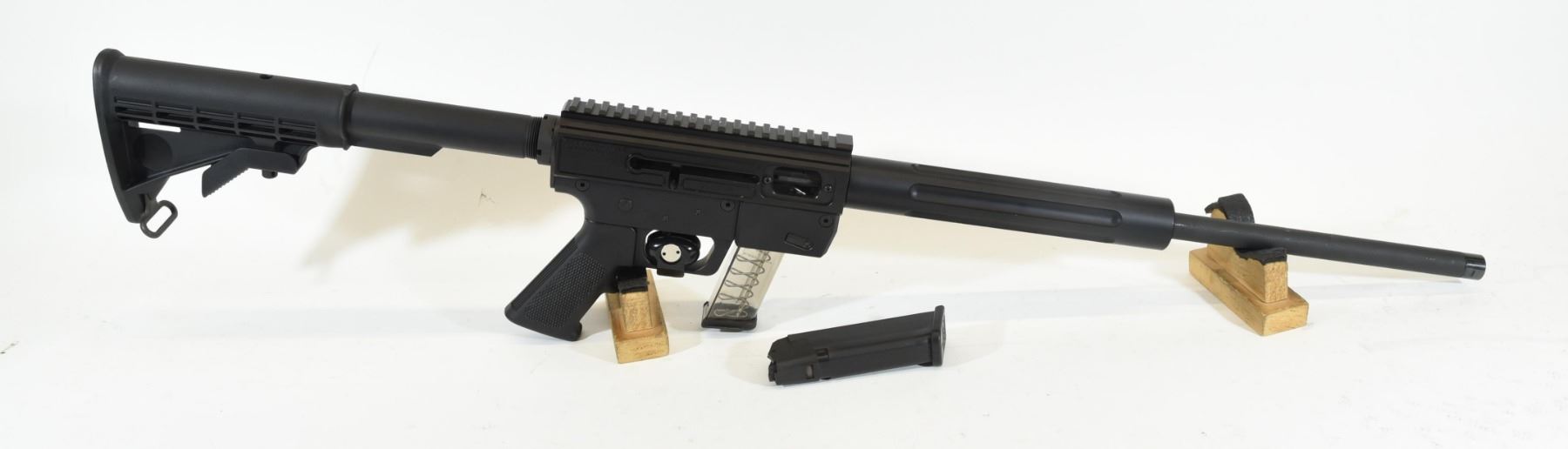 Non-restricted, semi-auto, 9mm Luger, 19" barrel. SN JRCV071704. Other than some small marks on bluing, very good overall. Two mags.