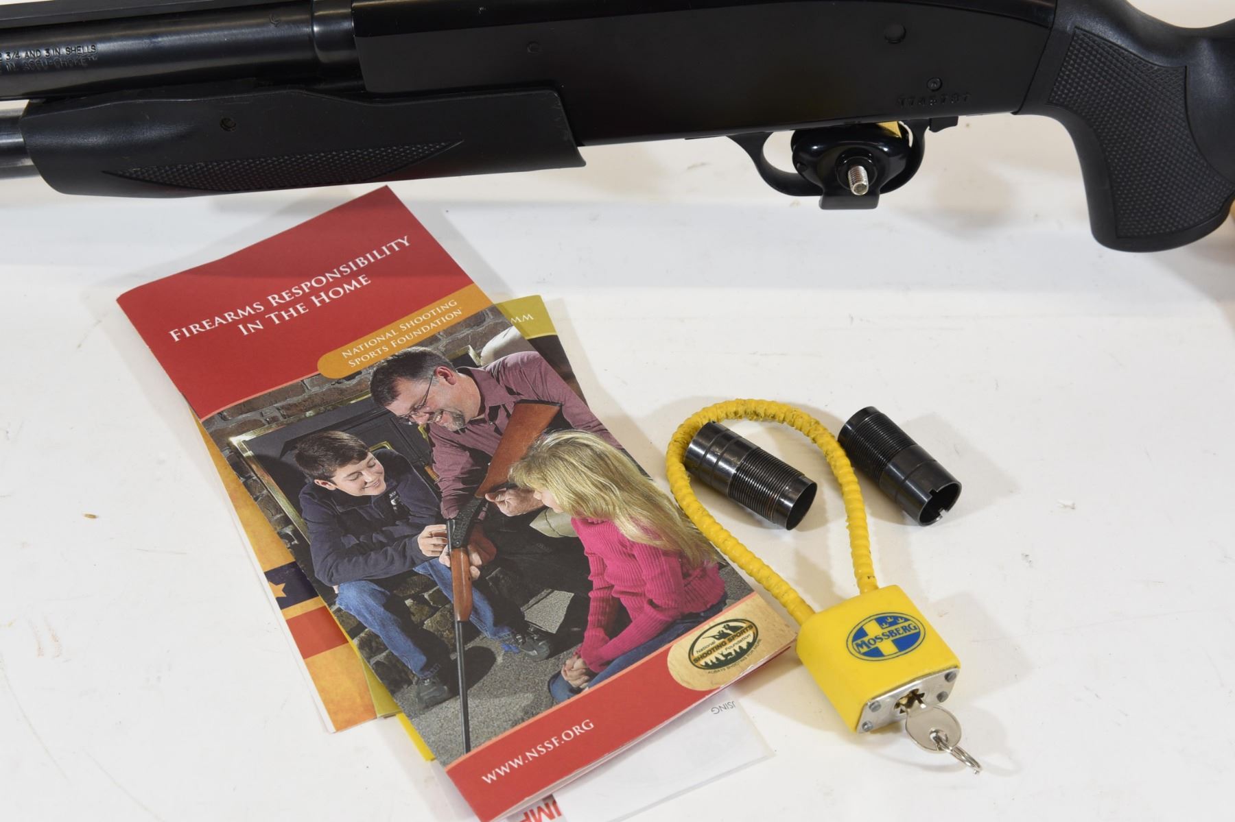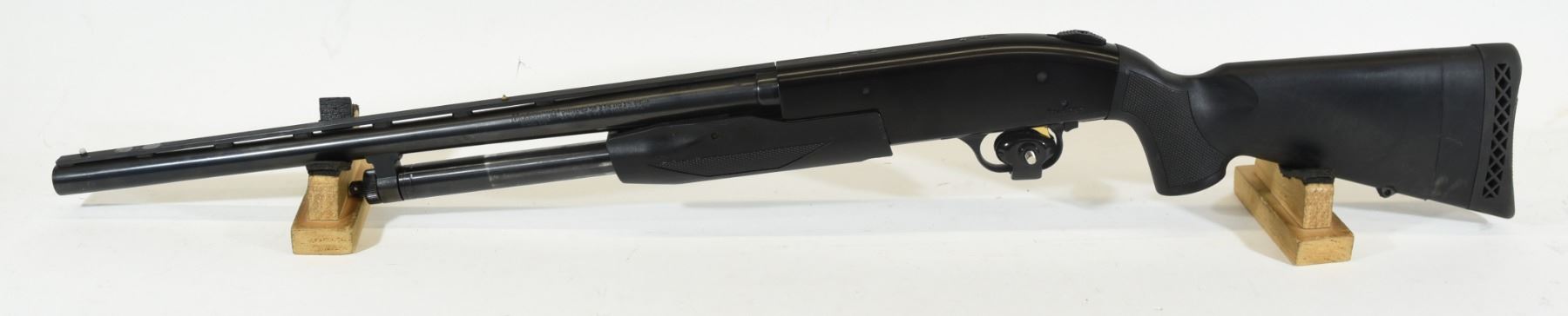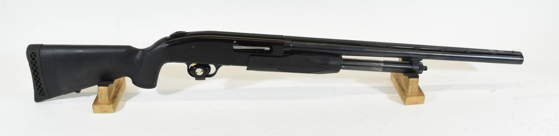 Non-restricted, pump action, 20Ga x 3", 18 1/2" vent rib barrel with removable chokes (F,M,IC). SN T745787. Synthetic stock has some scratches, bluing on receiver marked by forearm, bore excellent.