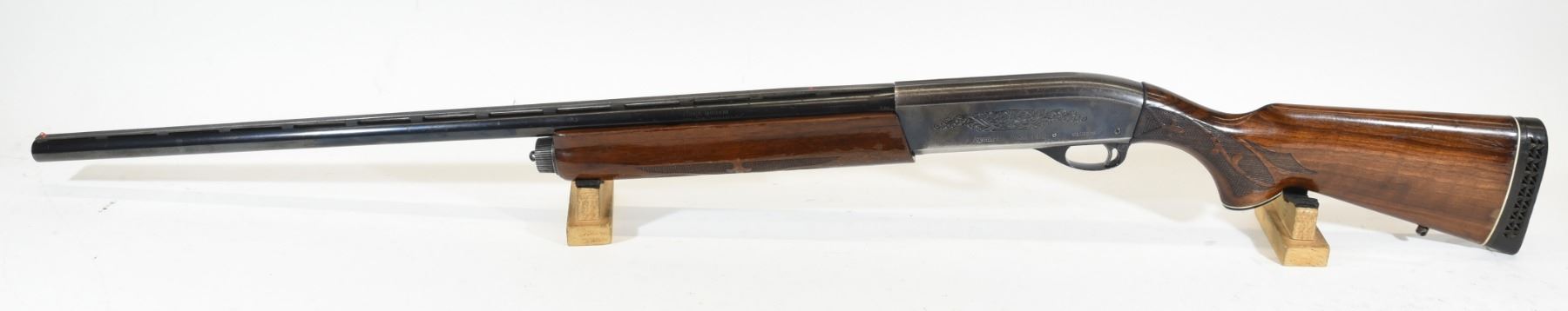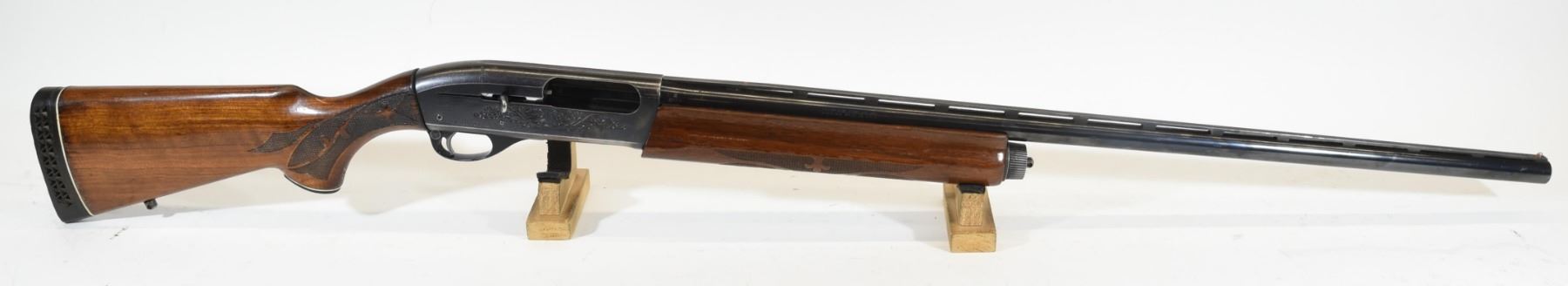 Non-restricted, semi auto, 12Ga x 3", 30" vent rib barrel with fixed full choke. SN N145808M. Wood forearm cracked, butt is chipped, bluing is grey and worn, bore excellent.