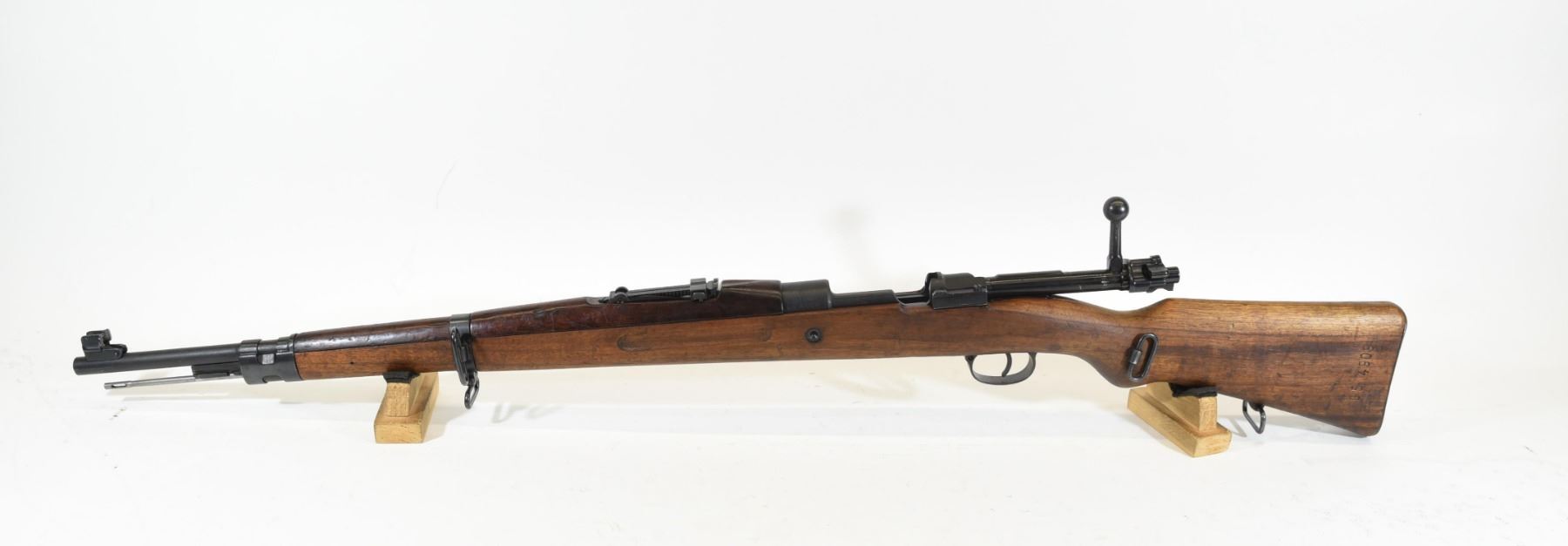 Non-restricted, bolt action, 8mm Mauser, 24" barrel. SN G54909. Wood has dents and marks, bluing faded with emblem filed off receiver, bore very good.