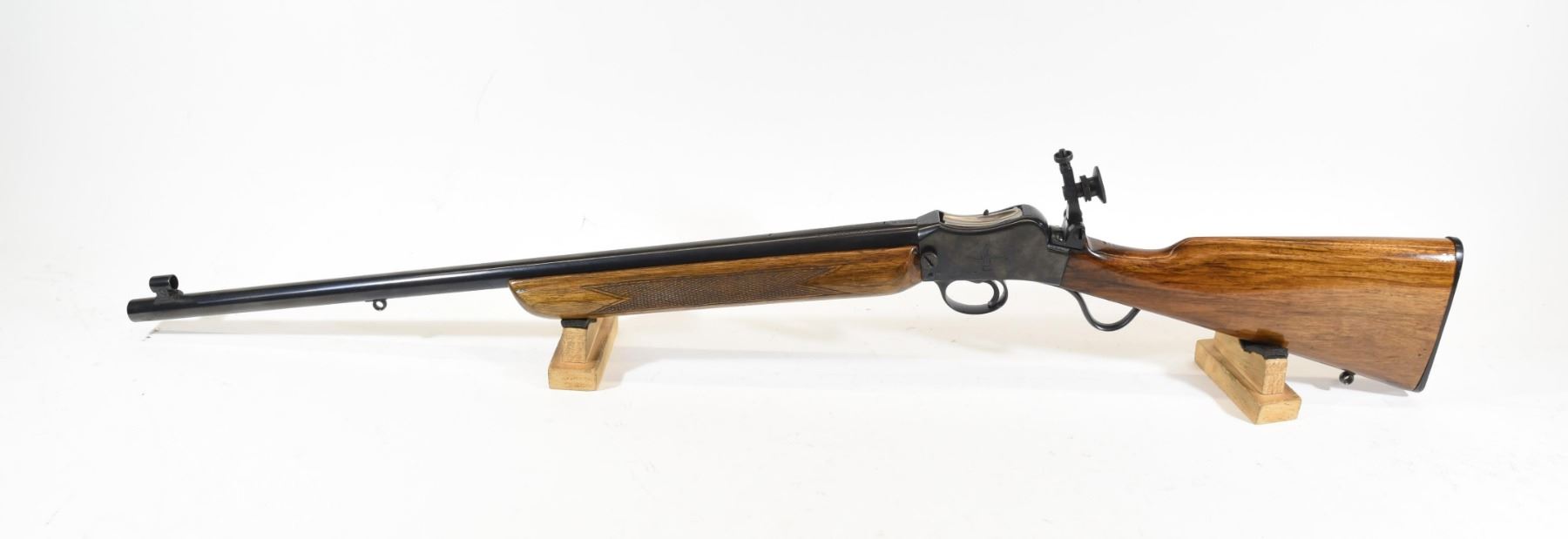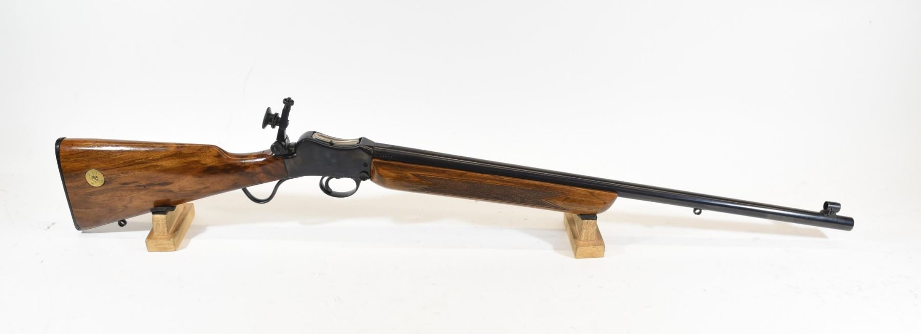 Non-restricted, single shot, 22LR, 25" barrel. SN 32717. Wood and bluing refinished, bore very good. Parker Hale rear peep.