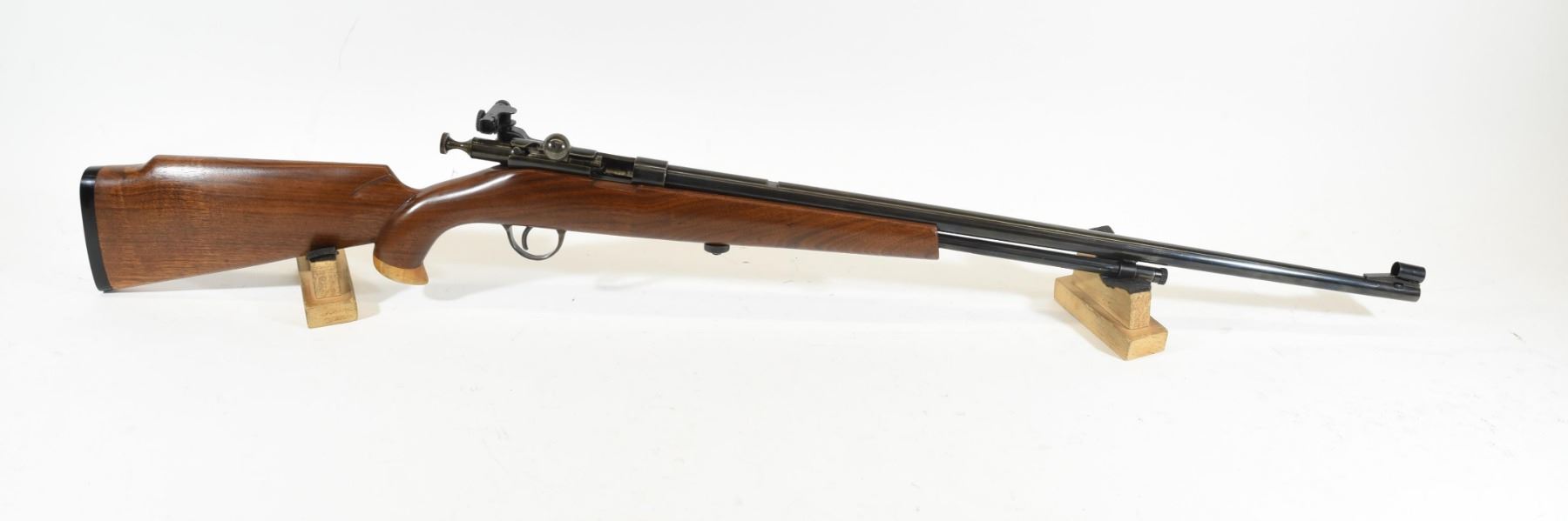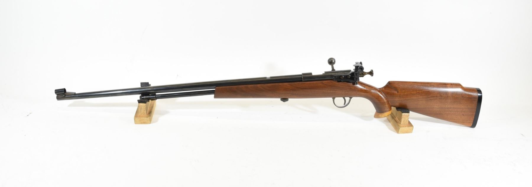 Non-restricted, bolt action, 22LR, 24" barrel. No SN. Custom wood excellent, bluing very good, bore very good. Mossberg S130 rear peep.