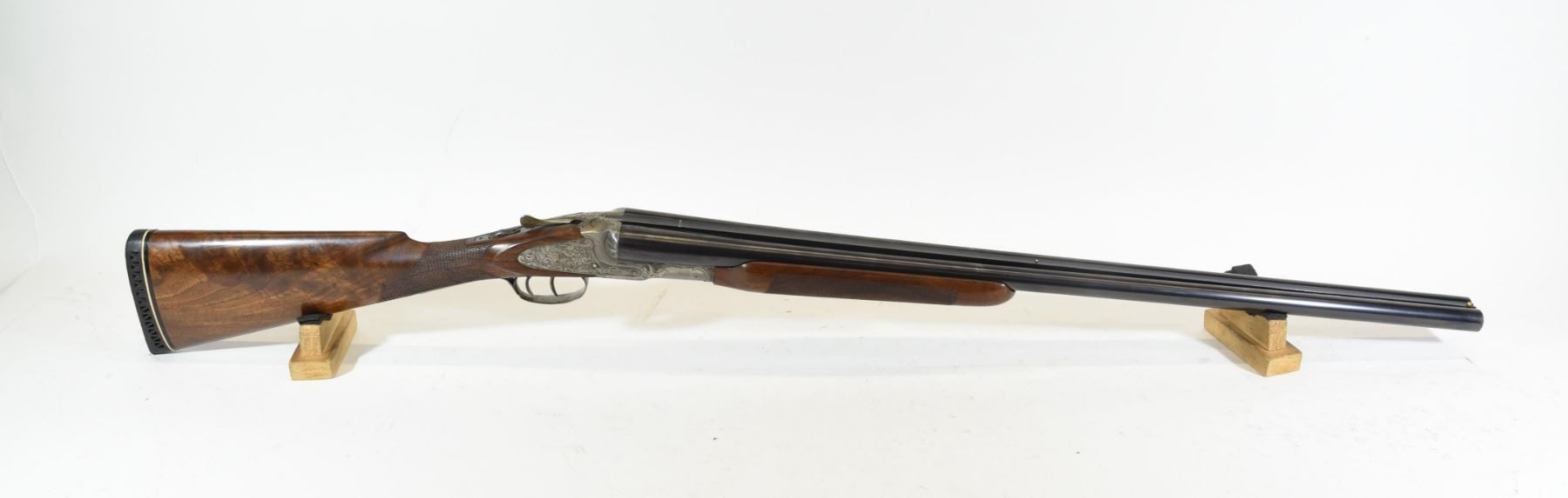 Non-restricted, multi-barrel, 12Ga x 2 3/4", 30" barrels with fixed chokes (.729). SN 216790. Restocked in fancy American walnut, bluing very good, bores excellent. Soft 3 way safety should be addressed, long length of pull, heavy waterfowl model, tight action.