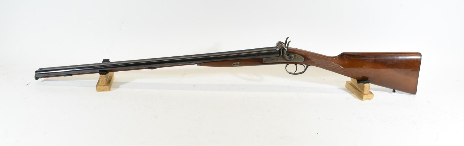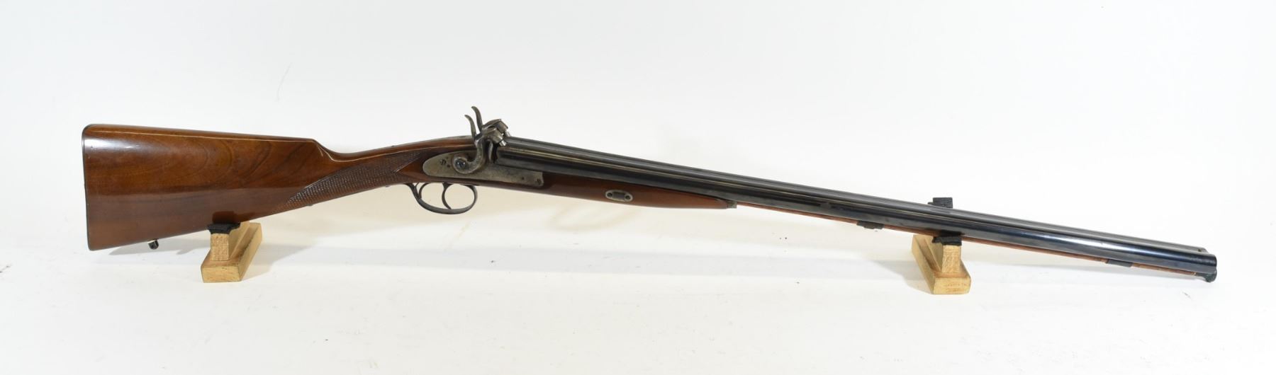 Non-Restricted, multi barrel, 12Ga percussion, SN 16856. Wood stock has several scratches, bluing has some scratches and rust near hammers and one patch of pitting on right barrel, bores are good.