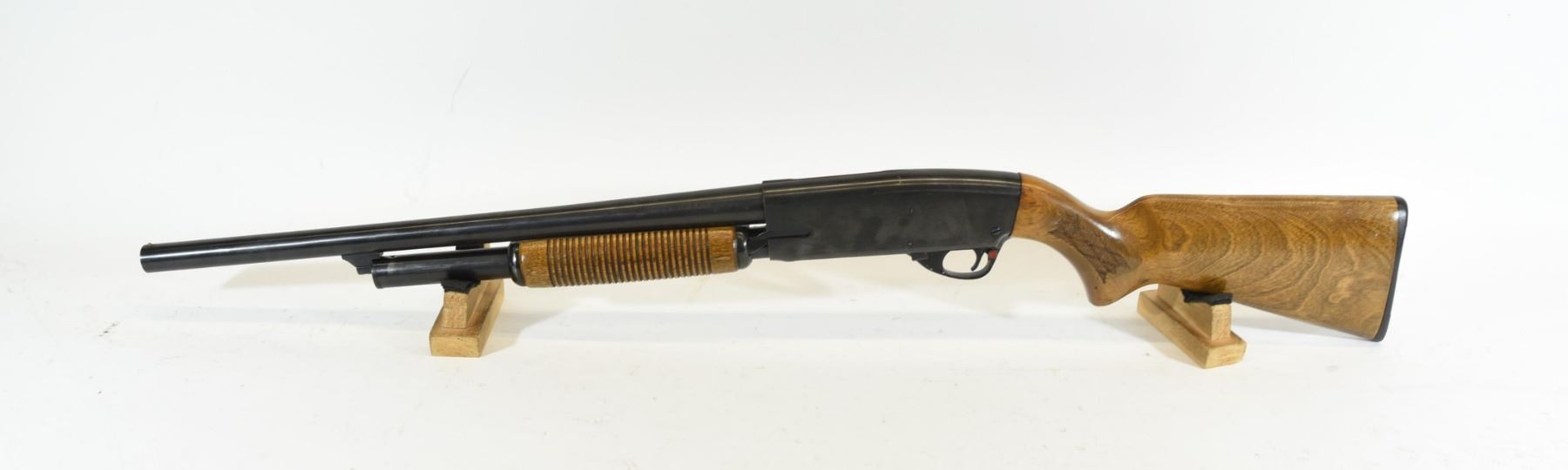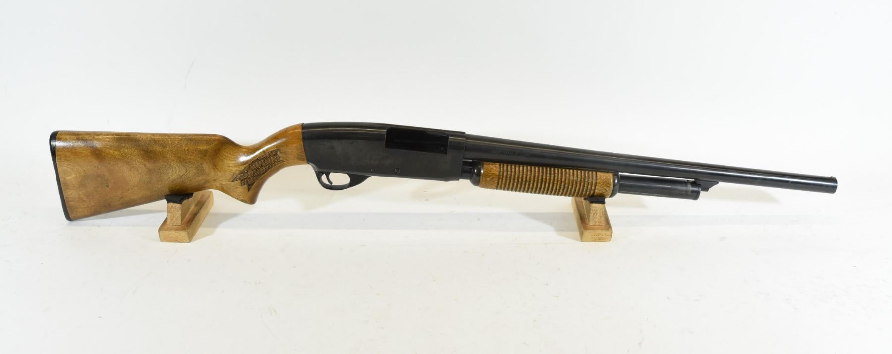 Non-restricted, pump action, 12Ga x 3", 19 1/2" barrel with fixed cylinder choke. SN A472247. Wood very good, bluing has a few marks, bore excellent.