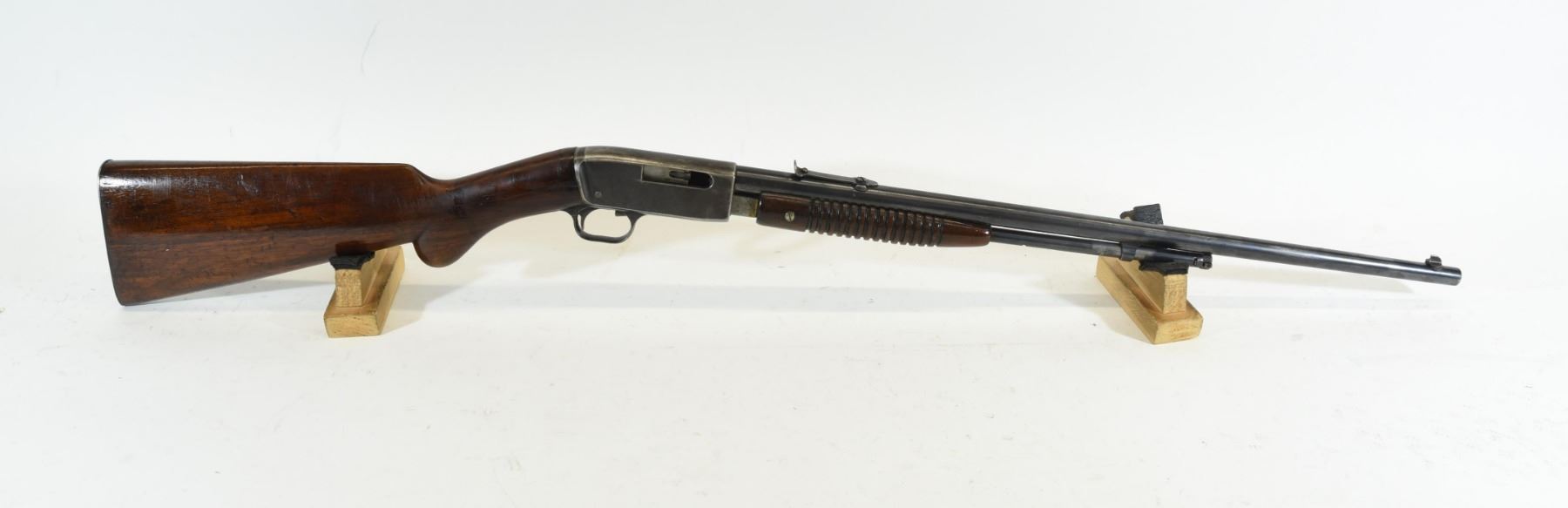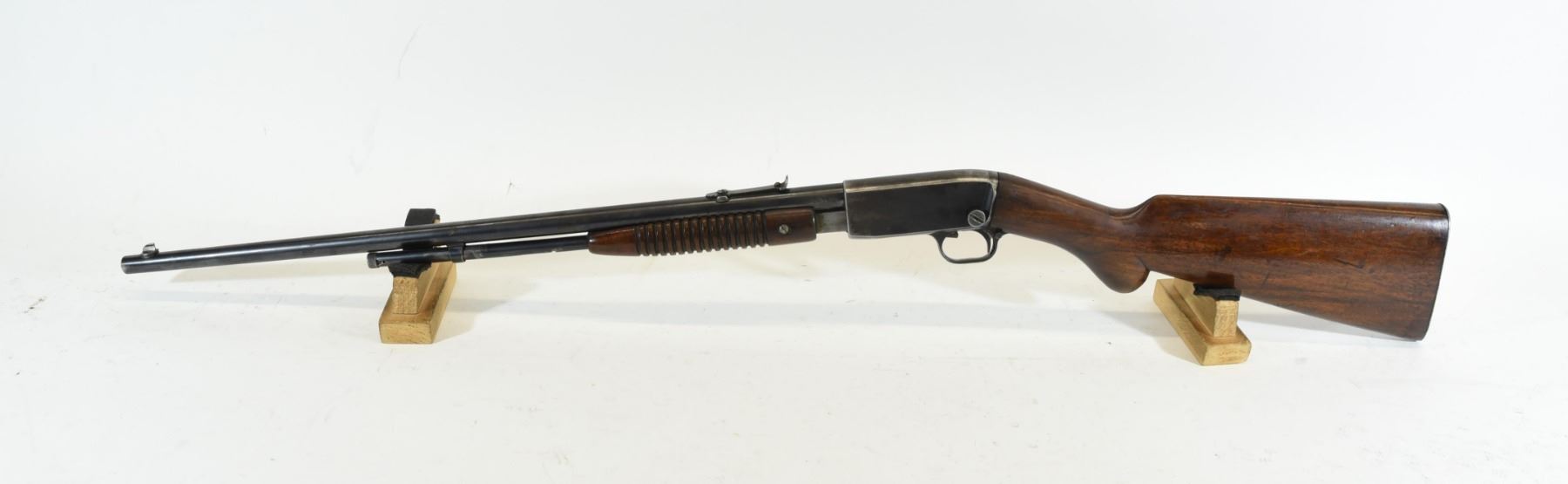 Non-restricted, pump action, 22 Long, 22" barrel. SN 17387. Wood has three cracks behind receiver through wrist, bluing is grey with some pitting, bore good.