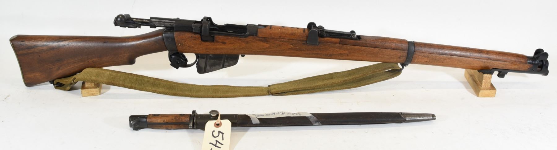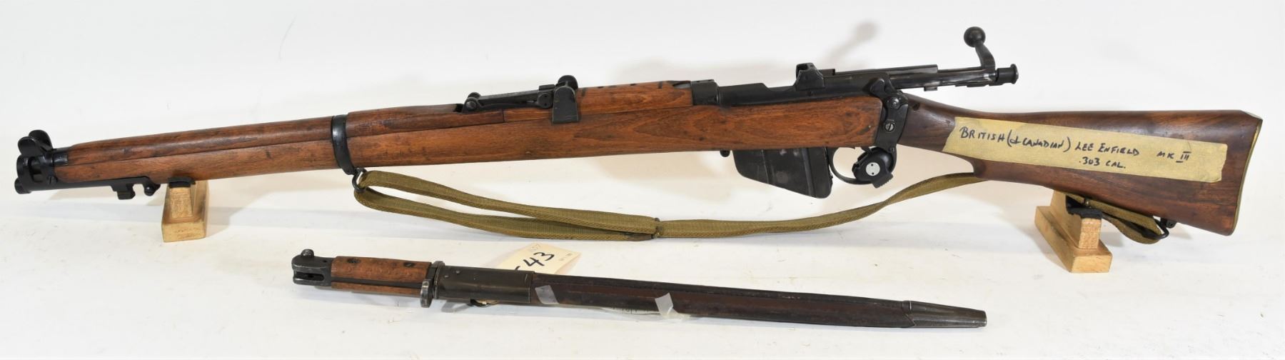 Non-restricted, bolt action, 303 British, 25" barrel, SN 47095. Wood has some scratches, bluing faded and worn off mag, bore good. Comes with bayonet.