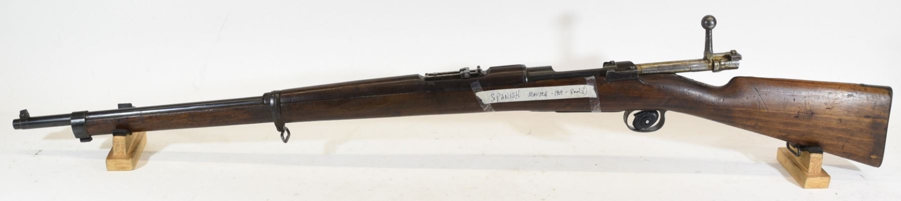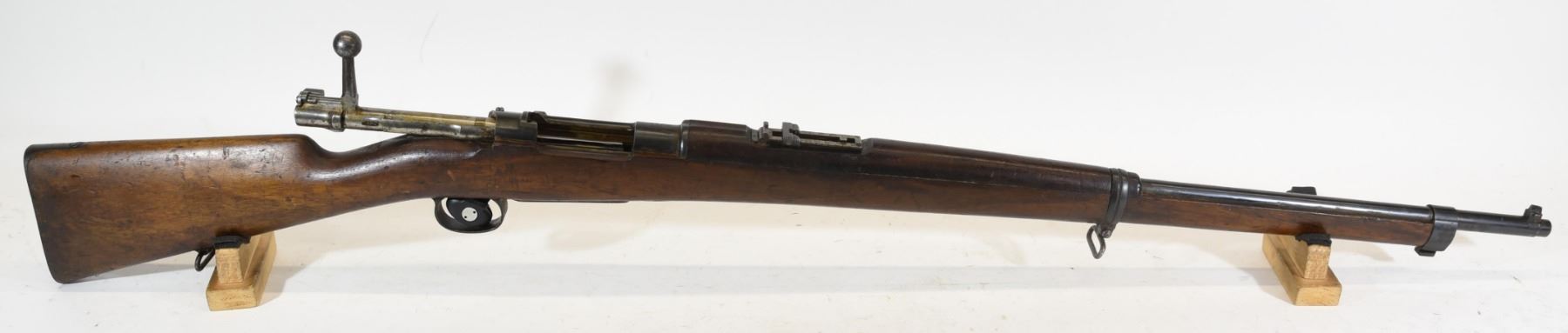 Non-restricted, bolt action, 7mm Mauser, 29" barrel, SN T708. Wood has numerous dents, scratches and marks, bluing has some pitting, bore dark, rifling barely visible. MFd 1909. Missing cleaning rod.