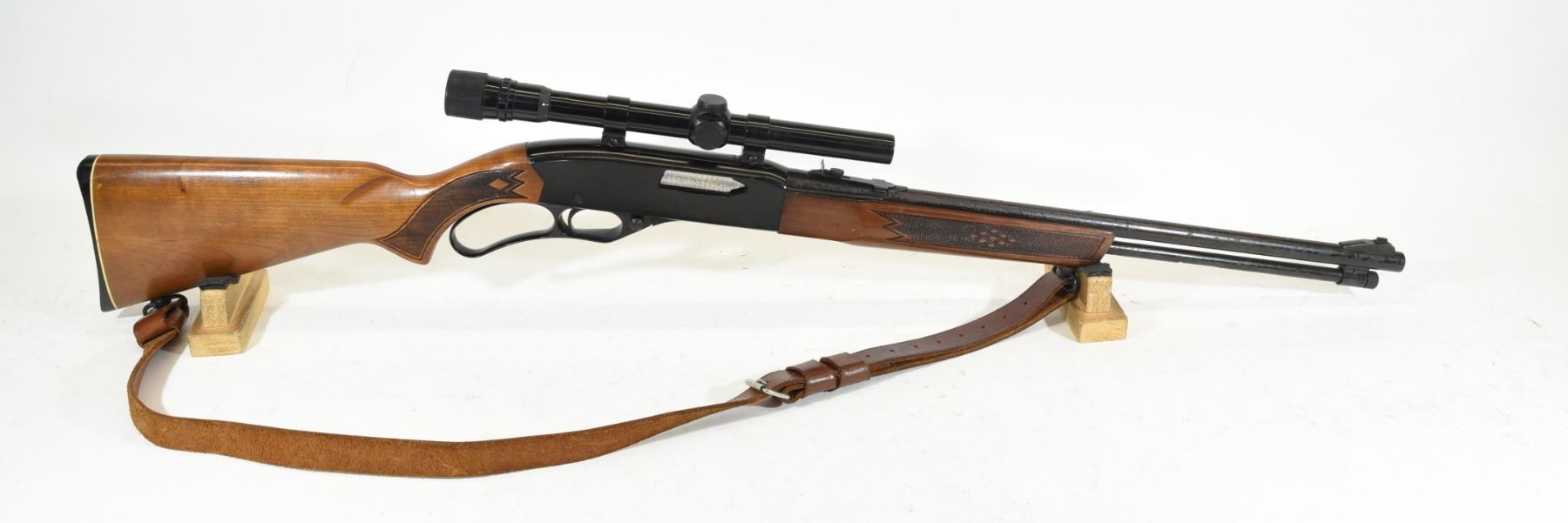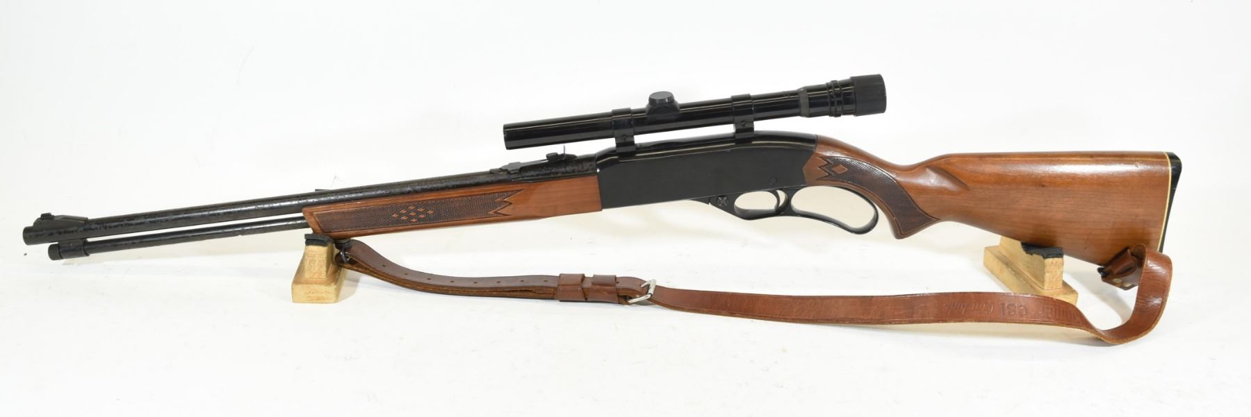 Non-restricted, lever action, 22 Magnum, 20" barrel, SN B811913. Wood has some scratches and marks, bluing is moderately pitted all over barrel, bore excellent. Comes with Weaver V22A scope and sling.