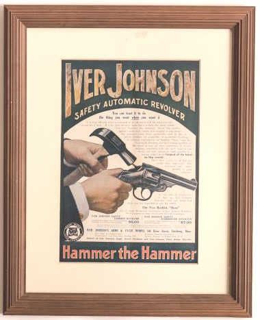 Iver Johnson Advertiser for Safety Automatic Revolver approximately 13 ¼ x 9”. Printers name on the bottom edge. It’s nicely framed and matted, not a reproduction. 36th year of manufacturing approximately 1930’s-40’s.Est.: $150-300