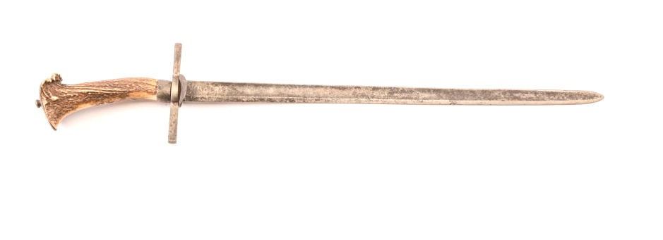 Germanic hunting sword with stag grip circa 1750-1820. Measures 21” overall with 16” blade. No scabbard. Moderate pitting. Good stag horn grip. A GI bring back. Est.: $150-$300