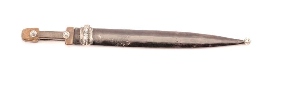 Caucasian Kenjal style dagger with horn grip and silver mounted leather scabbard with 13 ¼” blade and 17” overall. Good to very good overall condition. 19th century. Type used in Steppes to Russia. Est.: $300-$600