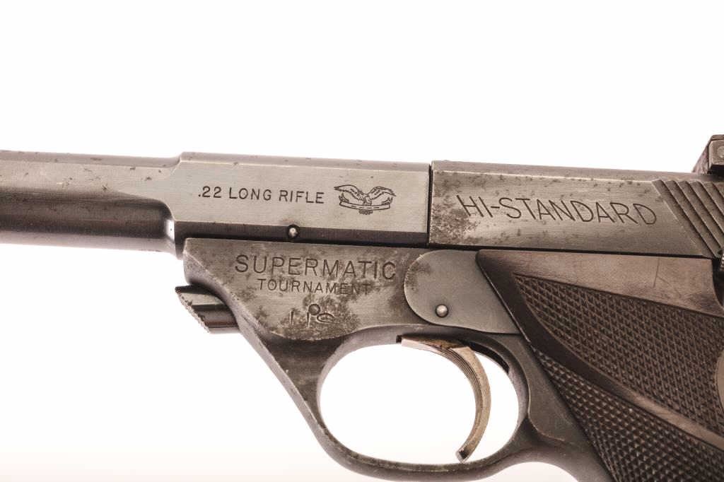 Scarce U.S. Property Marked Hi-Standard Supermatic Tournament 22 Caliber Semi-Auto pistol. Has 6” barrel, model 103, S/N 1134602. Good condition with 60-80% original blue with minor erosion and even loss offinish. Has excellent bore, with some cleaning and slight pitting around. Est.: $350-700