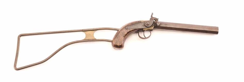 Warren of Albany single shot percussion “Buggy” gun, .45 caliber, Serial #NSNV. The pistol is in good overall condition with an 8” octagon barrel. The metal surfaces have gone to a uniform brown patina with sharpedges on the barrel. The side plate is lightly engraved and is marked, “WARREN ALBANY”. The smooth wood pistol grips are in good condition with beautiful figure and a silver flower at the base of the grip. Theskeletonized metal butt stock gives the piece an overall length of 24 ½” and is in good condition. A neat old “Buggy” gun with a removable stock. Est.: $700-$1,400. (Antique).