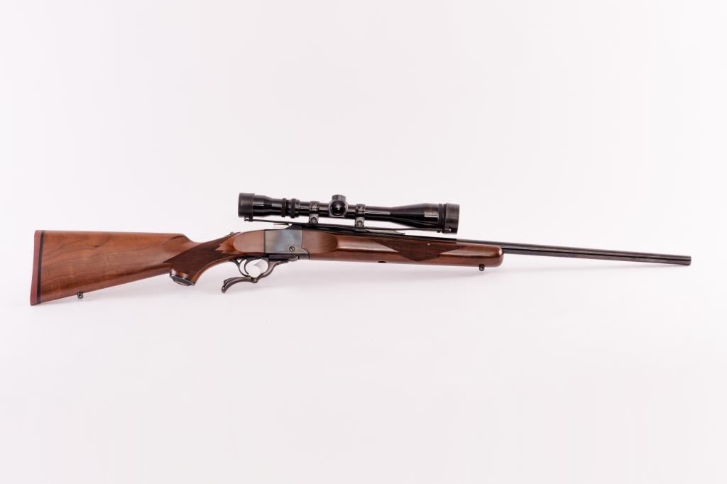 Ruger #1 Sporting rifle in .30-06 caliber with 28” barrel mounted with Weaver V-12 scope on Ruger mount, S/N 132-23907. Fine to excellent used condition. 96%-99% overall. Slight handling with minor firing and useonly. Ruger recoil pad. Excellent bore and mechanics. Est.: $600-$1200