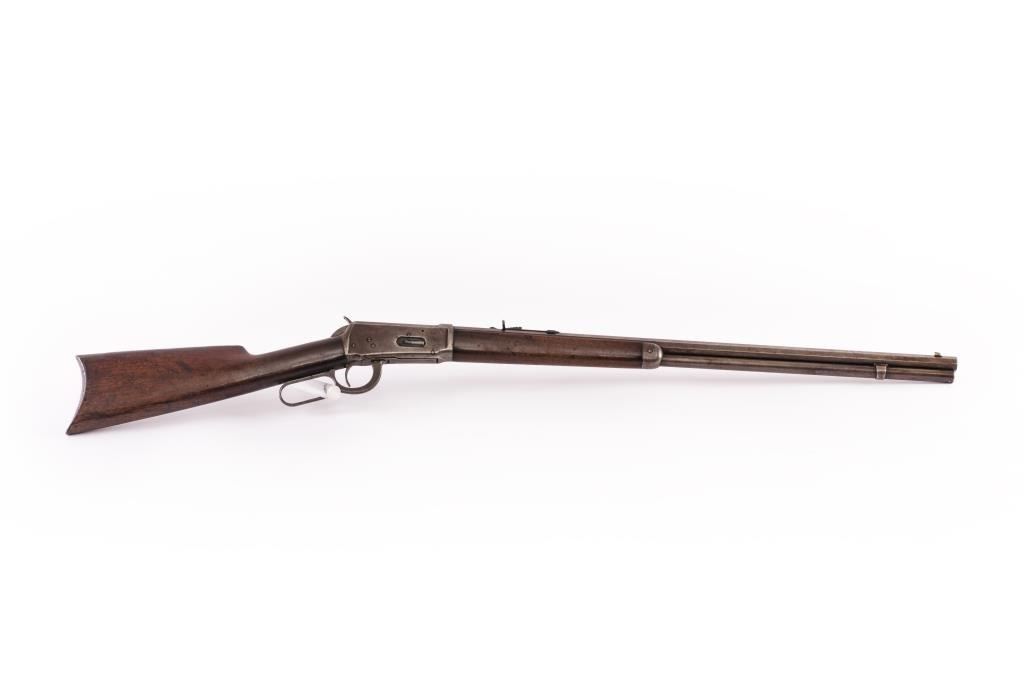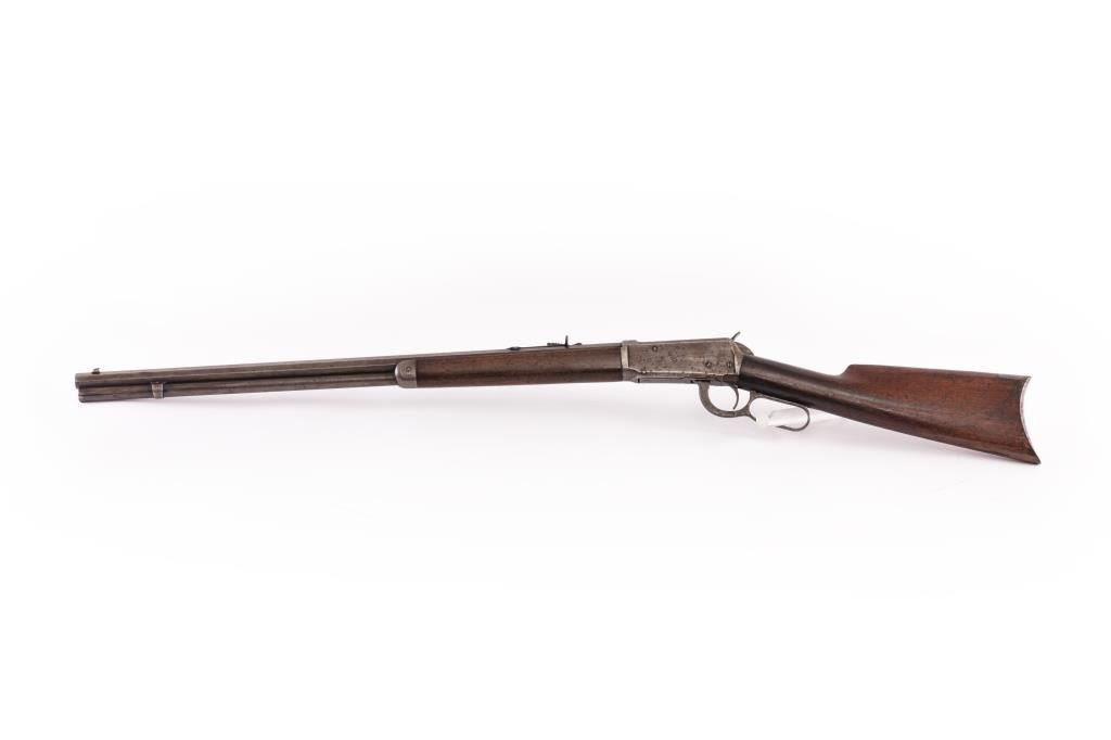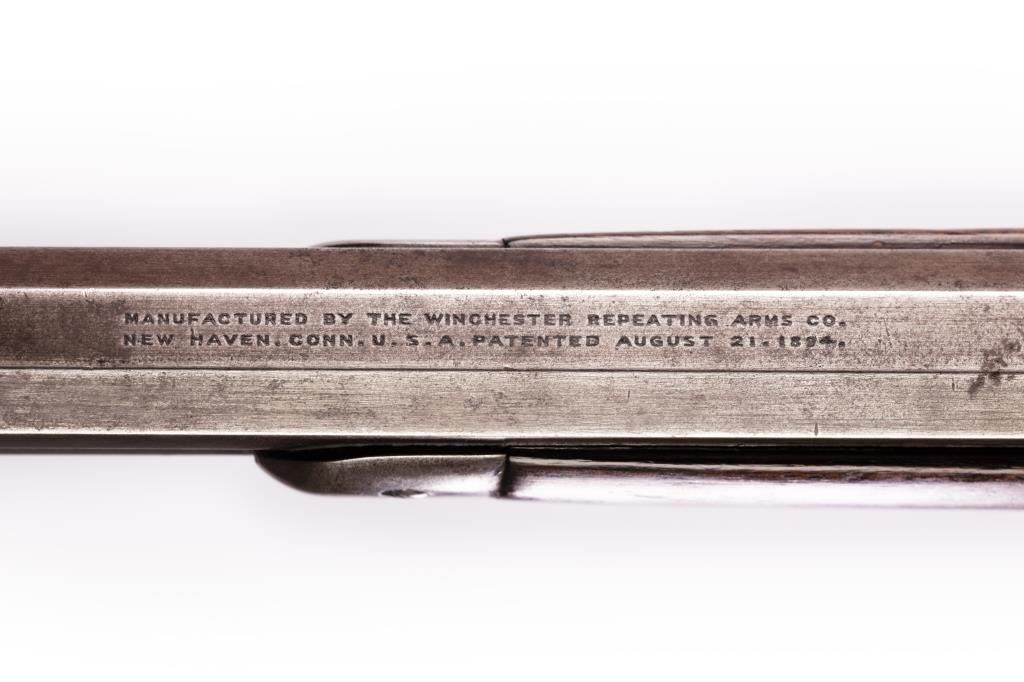 Winchester Model 1894 38-55 caliber rifle with 26” octagon barrel, full magazine, crescent butt. Serial #211459. Early turn of the century, stamped DD for ranch (possibly Colorado?). Good to very good overall, withsharp markings, good wood and good bore. Est.: $900-1,800.