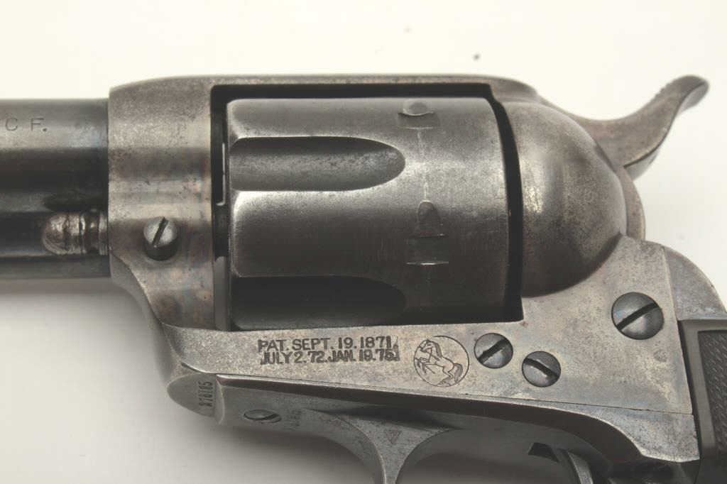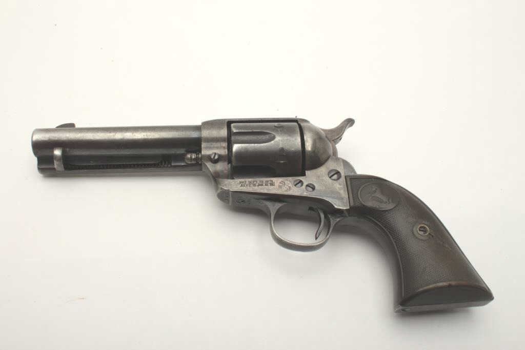 Colt SAA revolver, .32 W.C.F. caliber, 4.75” barrel, blued and case hardened finish, checkered hard rubber grips with repair to left side grips and crack in right side grip; S/N 276185; overall good condition withoriginal blue areas on barrel assembly underside and top of barrel, traces of original case colors in protected areas of frame, original blue areas on trigger guard and in flutes of cylinder; good bore, goodmarkings; accompanied by a classic tooled leather single loop holster. (C&R/PPT). Est.: $1,400-$2,800.
