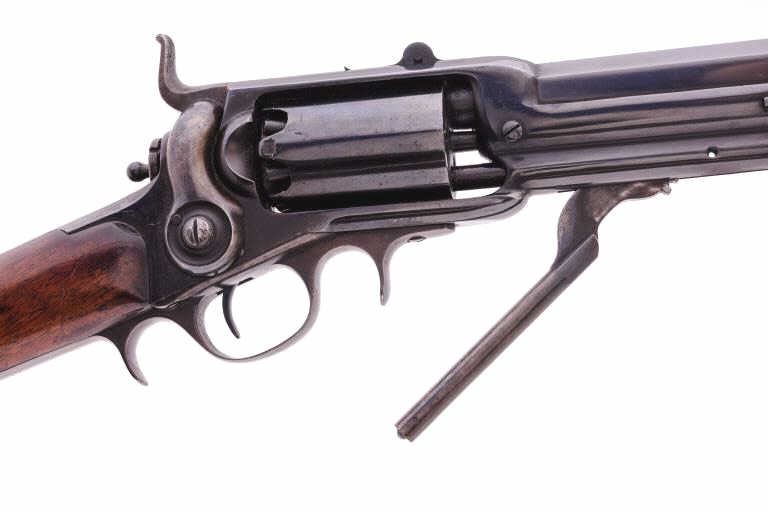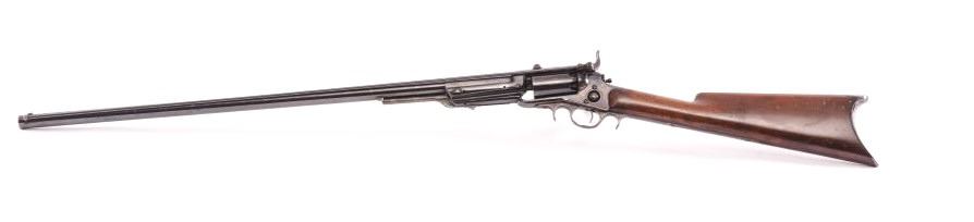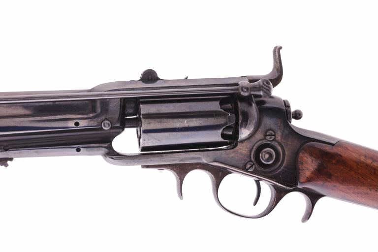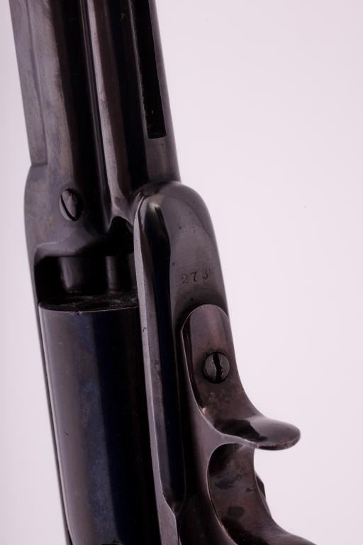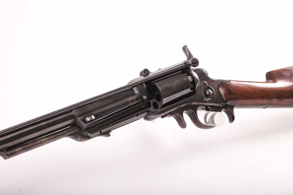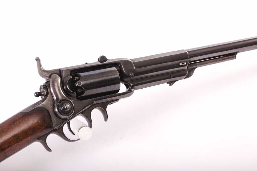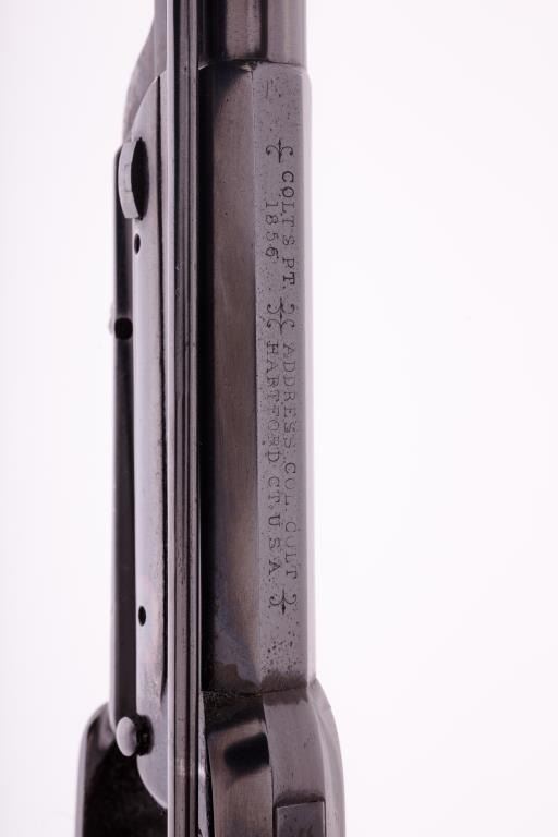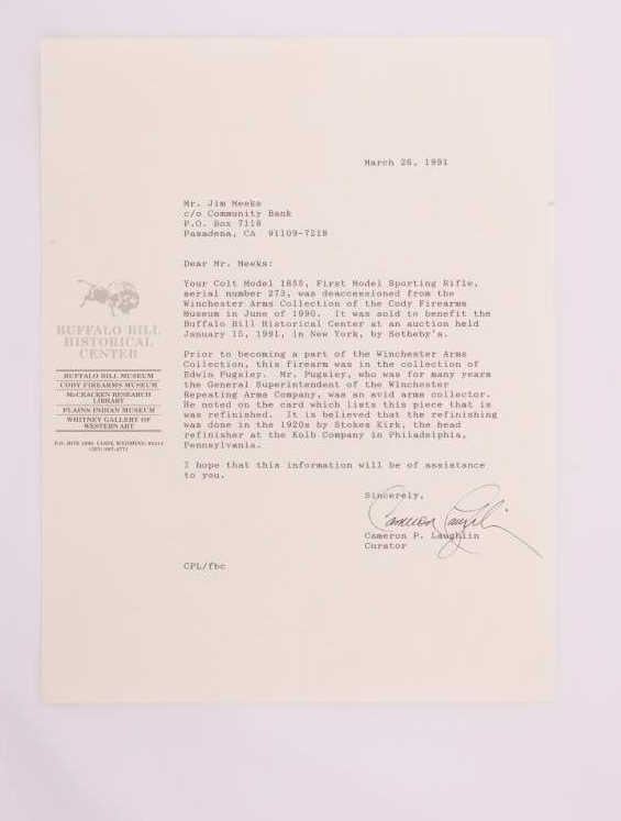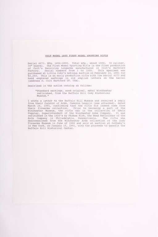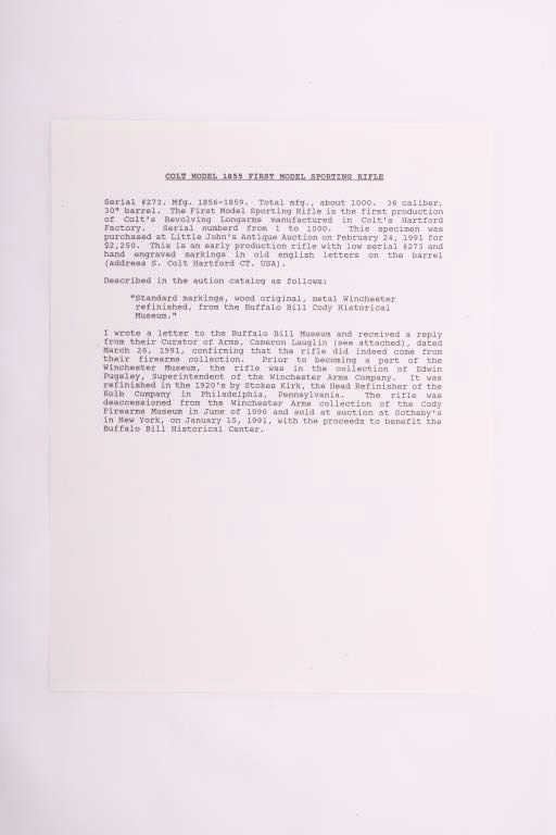 Colt Model 1855 First Model percussion Sporting rifle, .36 caliber, 30” barrel, older re-blued finish, wood butt stock, S/N 273; overall good to very good condition as re-finished, crisp action, visible markings,majority of quality re-finish to metal surfaces remaining, good wood stock displaying scattered mars and scratches from carry and display. Accompanied by typewritten notes and letters related to this Colt Sporting rifle that includes letter from Cameron P. Laughlin, Curator of the Buffalo Bill Historical Center confirming this rifle, by serial number, was de-accessioned from the Winchester ArmsCollection of the Cody Firearms Museum in June of 1990. It was sold to benefit the Buffalo bill Historical Center at an auction held Jan. 15, 1991, in New York, by Sotheby’s. The letter goes on to state“Prior to becoming a part of the Winchester Arms Collection, this firearm was in the collection of Edwin Pugsley. Mr. Pugsley, who was for many years the general Superintendent of the Winchester Repeating