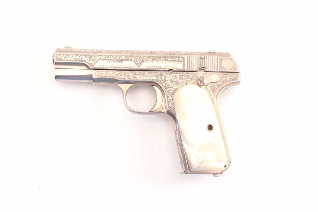 Colt Model 1903 Pocket Hammerless semi-automatic pistol, .32 caliber, Serial #255808. The pistol is in fine overall condition as finely engraved with magnificent pearl grips. The pistol retains nearly allof its nickel finish with ornate engraving and a sharp Rampant Colt emblem at the left rear of the slide. The smooth pearl grips are in very good condition. The bore is good, the action is crisp and the markingsare sharp. The lot includes one correct Colt marked magazine. Est.: $1,500-$3,000. (C+R/PPT).