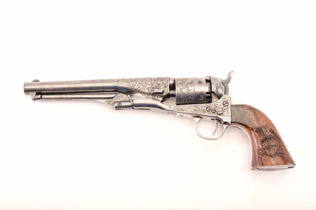 Colt 1861 New Blackpowder series B6 caliber percussion revolver S/N 45386. Its factory engraved, silver plated, and has carved wood eagle grips with Sam L Colt on backstrap. 1 of few produced by custom workshopre-creating Custer’s Colts. In excellent condition with toned silver in associated case. Est.: $1,400-2,800.
